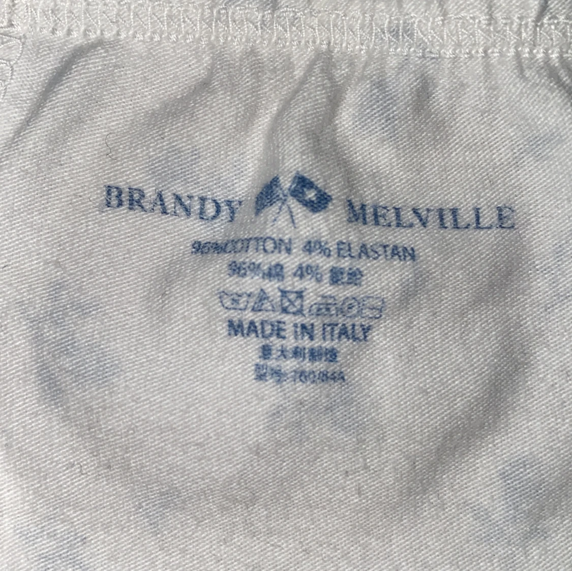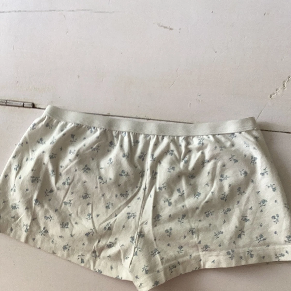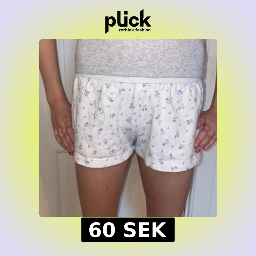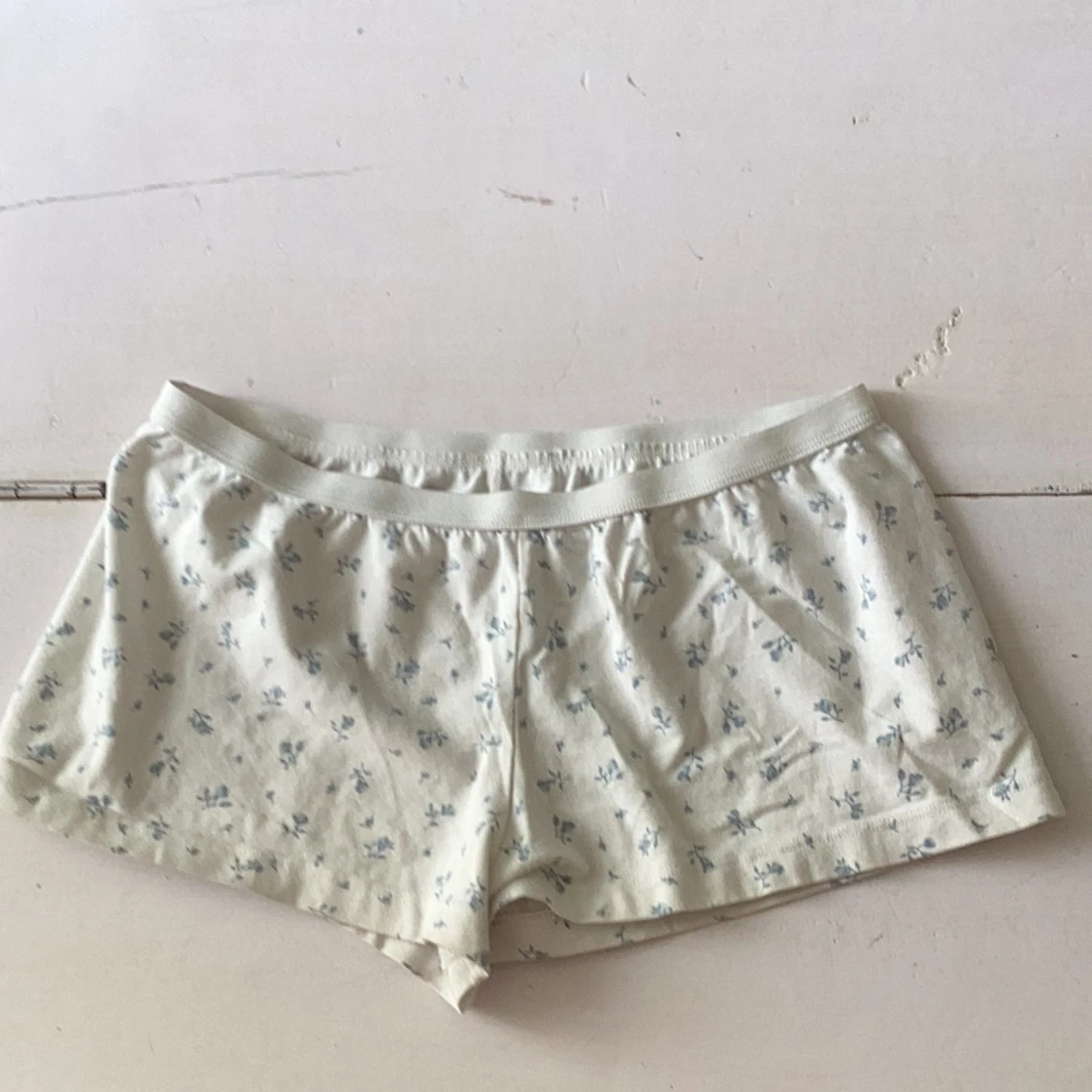Säljer ett par vita shorts från Brandy Melville med små blå blommor. De har en normal passform och resår i midjan för extra komfort. Materialet är mjuk bomull med lite elastan för stretch. Perfekta för mysiga kvällar!