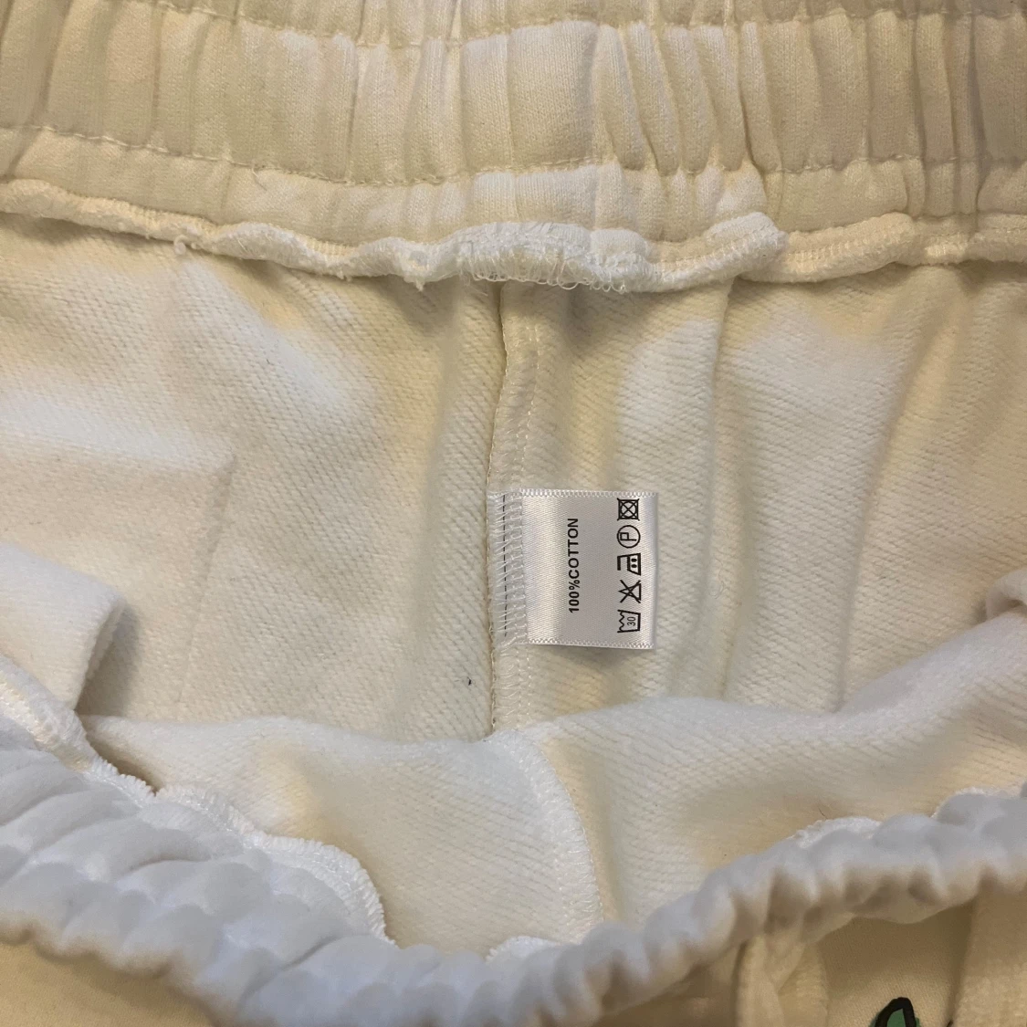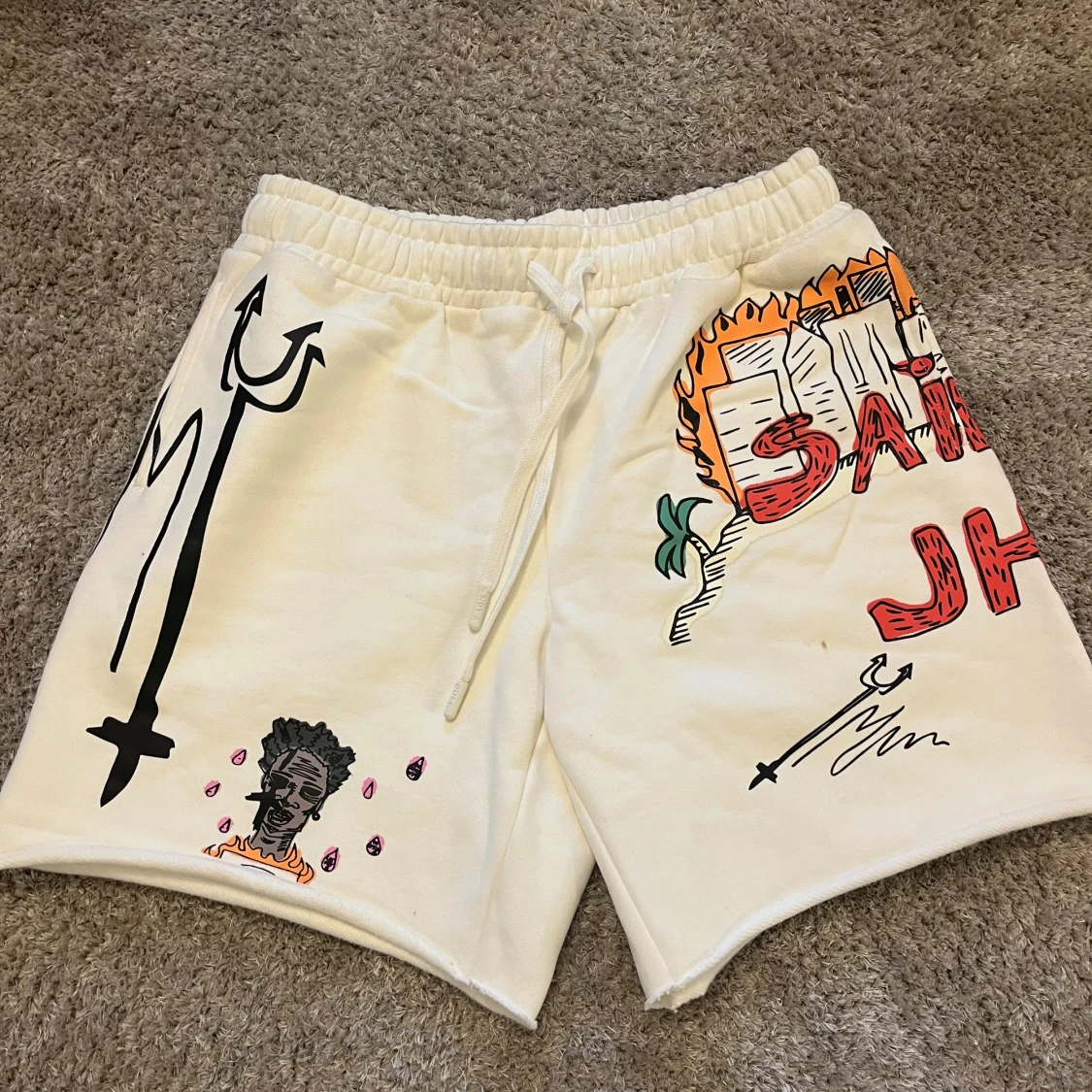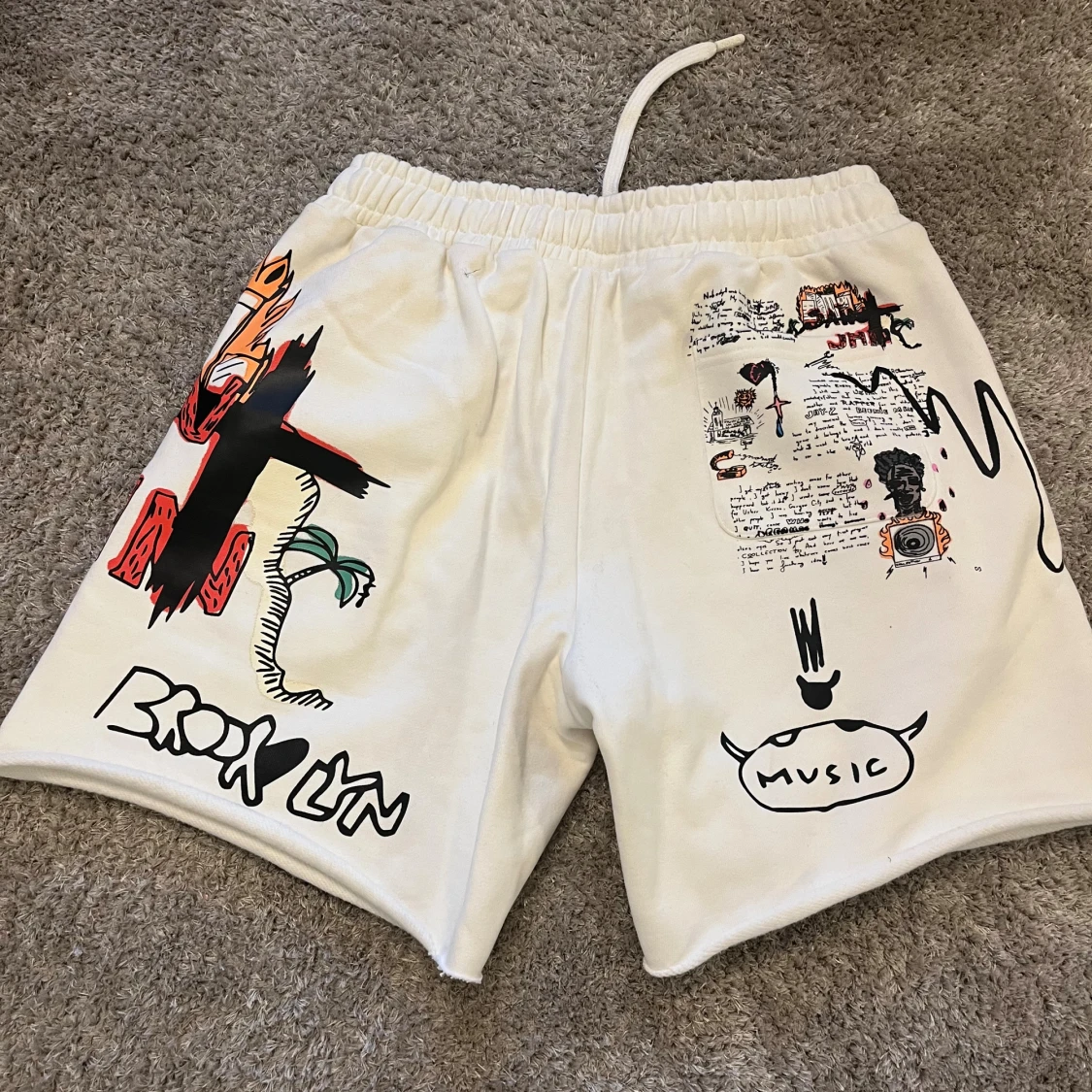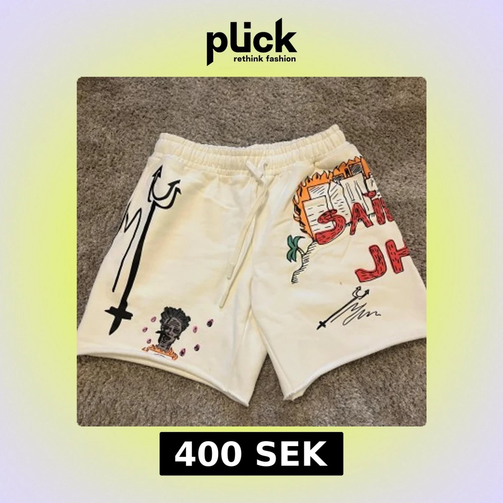 Unika vita shorts i 100% bomull med elastisk midja och snörning. Shortsen kommer från Christian Sex Club. Ord. Pris 1040 kr. Shortsens framsida och baksida är täckta av coola grafiska tryck, teckningar och text, bland annat eld, palmer, ansikten och Brooklyn- och musikmotiv. Perfekta för dig som vill sticka ut med streetstyle.