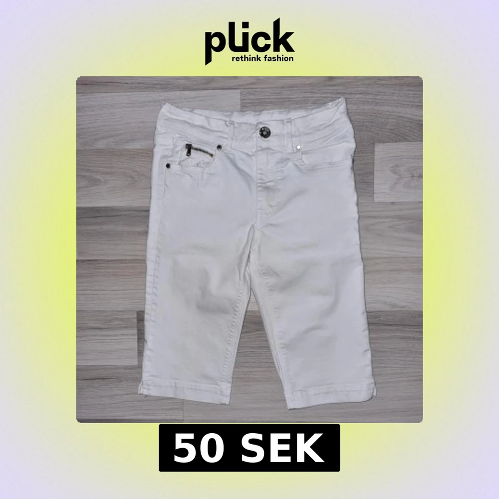 Snygga vita denimshorts från H&M i klassisk femficksmodell. Shortsen har coola dragkedjedetaljer på fickorna både fram och bak samt knappstängning och bälteshällor. Perfekta för en fräsch och stilren look.