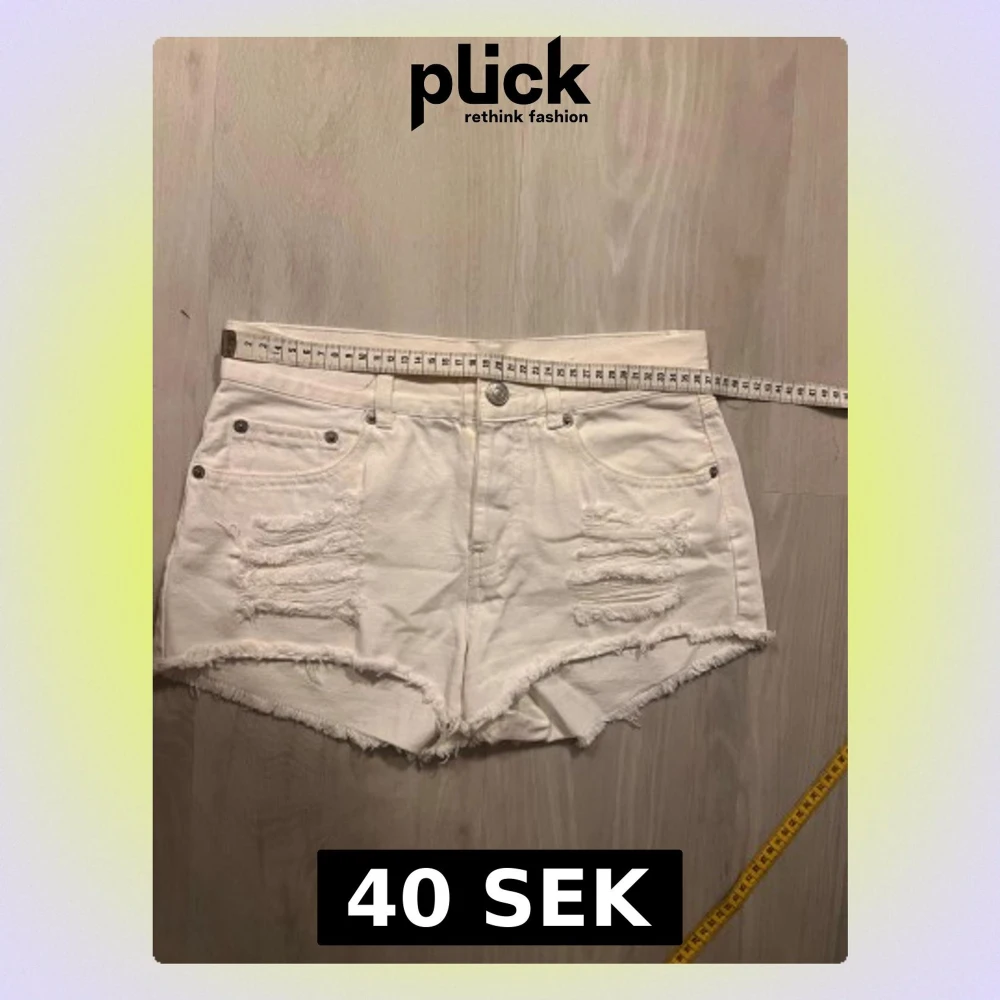 Säljer ett par vita jeansshorts. Shortsen har slitna detaljer framtill och klassiska fem fickor med silverfärgade nitar. Perfekta för sommarens alla äventyr!