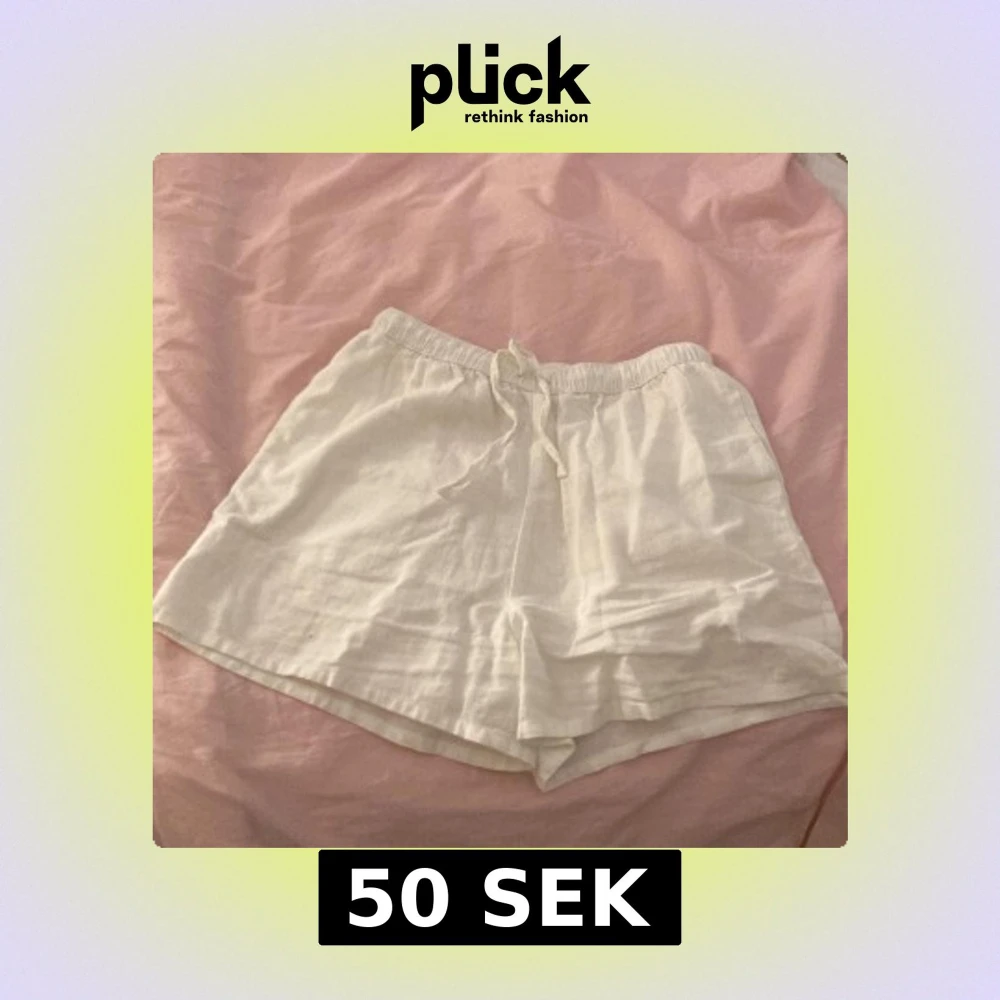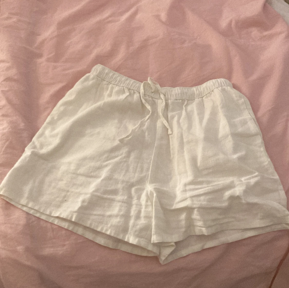 Säljer ett par vita, luftiga shorts i linne med elastisk midja och snörning framtill. Perfekta för varma dagar och har en avslappnad passform. Stilrena och enkla att matcha med det mesta. 😍😍😍