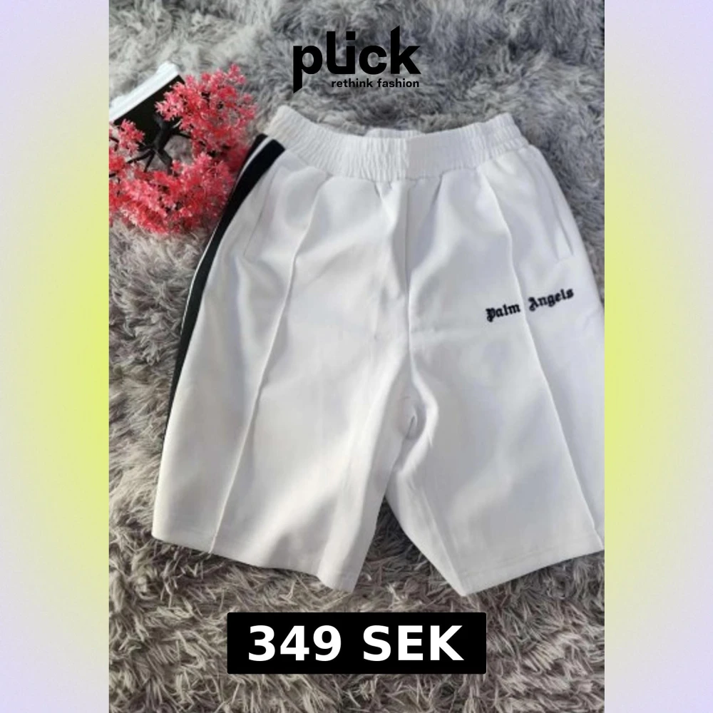 Snygga vita shorts från Palm Angels med svart logga broderad på ena benet och svart rand längs sidan. De har elastisk midja och är gjorda i 100% polyester, vilket ger en sportig vibe. Perfekta för dig som gillar streetwear och vill sticka ut.
