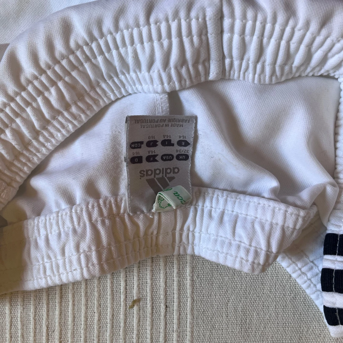 Snygga vita Real Madrid shorts från Adidas i storlek M med svarta ränder längs sidorna och broderad klubbmärke. Elastisk midja för skön passform. Perfekta för fotboll eller chill. Materialet är polyester som andas bra.