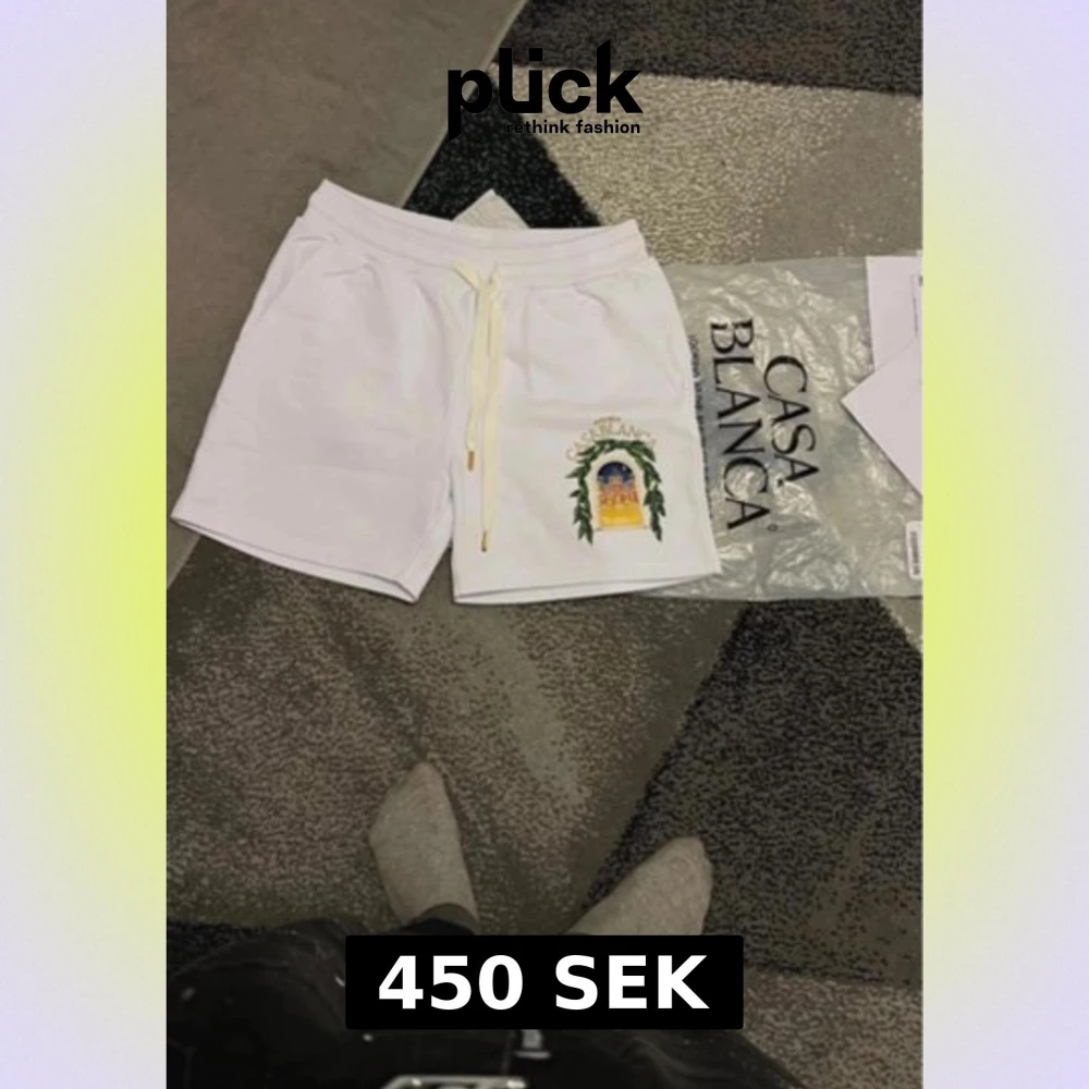 Säljer ett par fräscha vita shorts från Casablanca med snyggt färgglatt tryck på ena benet och gul snörning i midjan. De har en relaxed fit och är perfekta för sommaren. Materialet känns mjukt och skönt, 100% bomull.