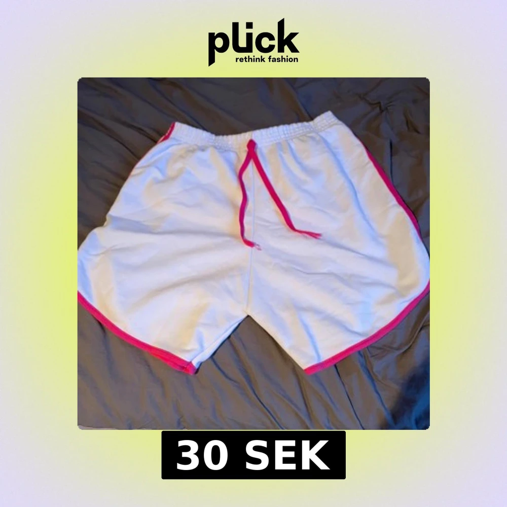 Säljer ett par vita shorts med rosa kant och snörning i midjan. De har en elastisk midja och tre rosa ränder längs sidorna. Storlek M