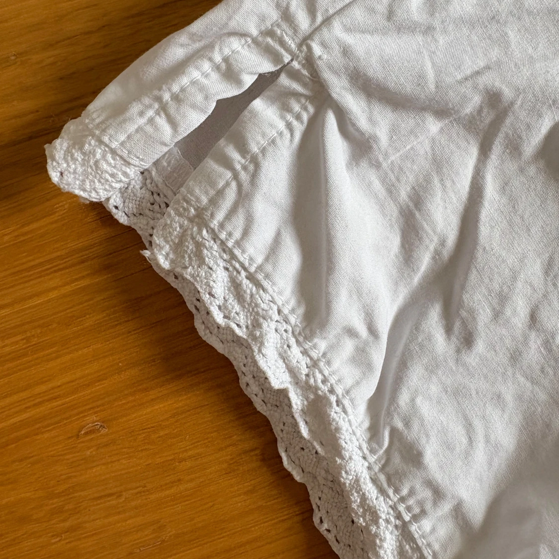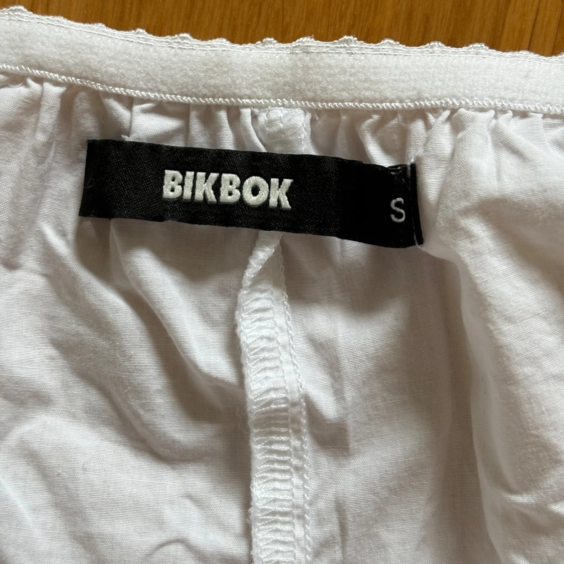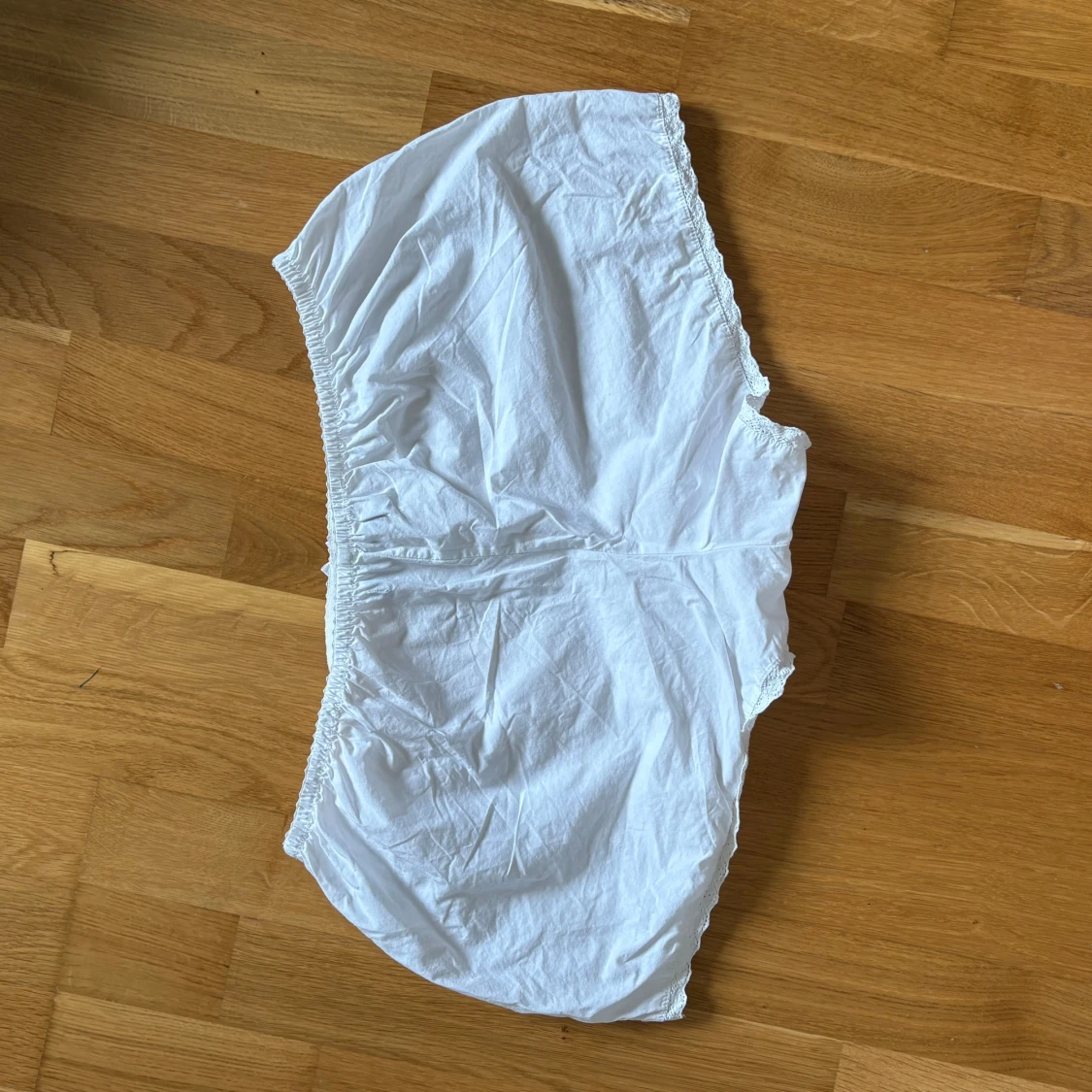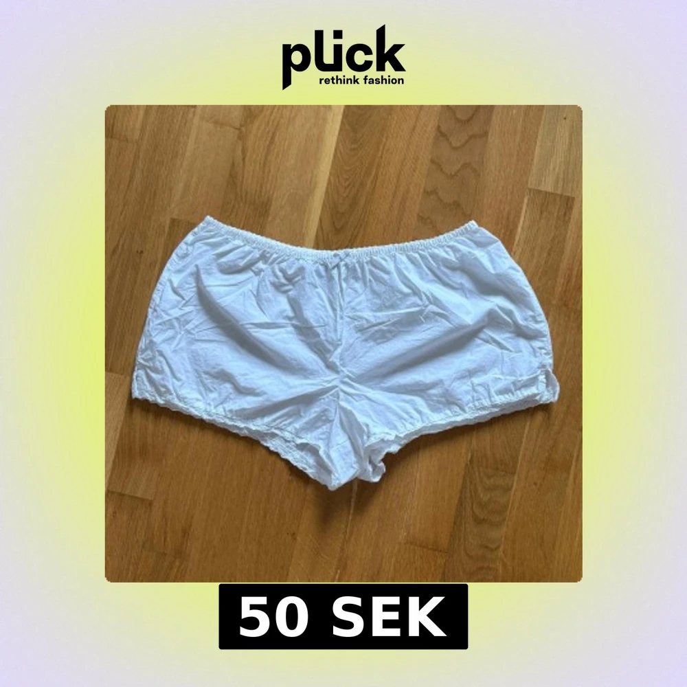 Säljer ett par jätte söta vita shorts från Bikbok i storlek S. De har elastisk midja, söt rosett framtill, liten slits på sidorna vid benen och spetsdetaljer längs bensluten. (Aldrig använda).
