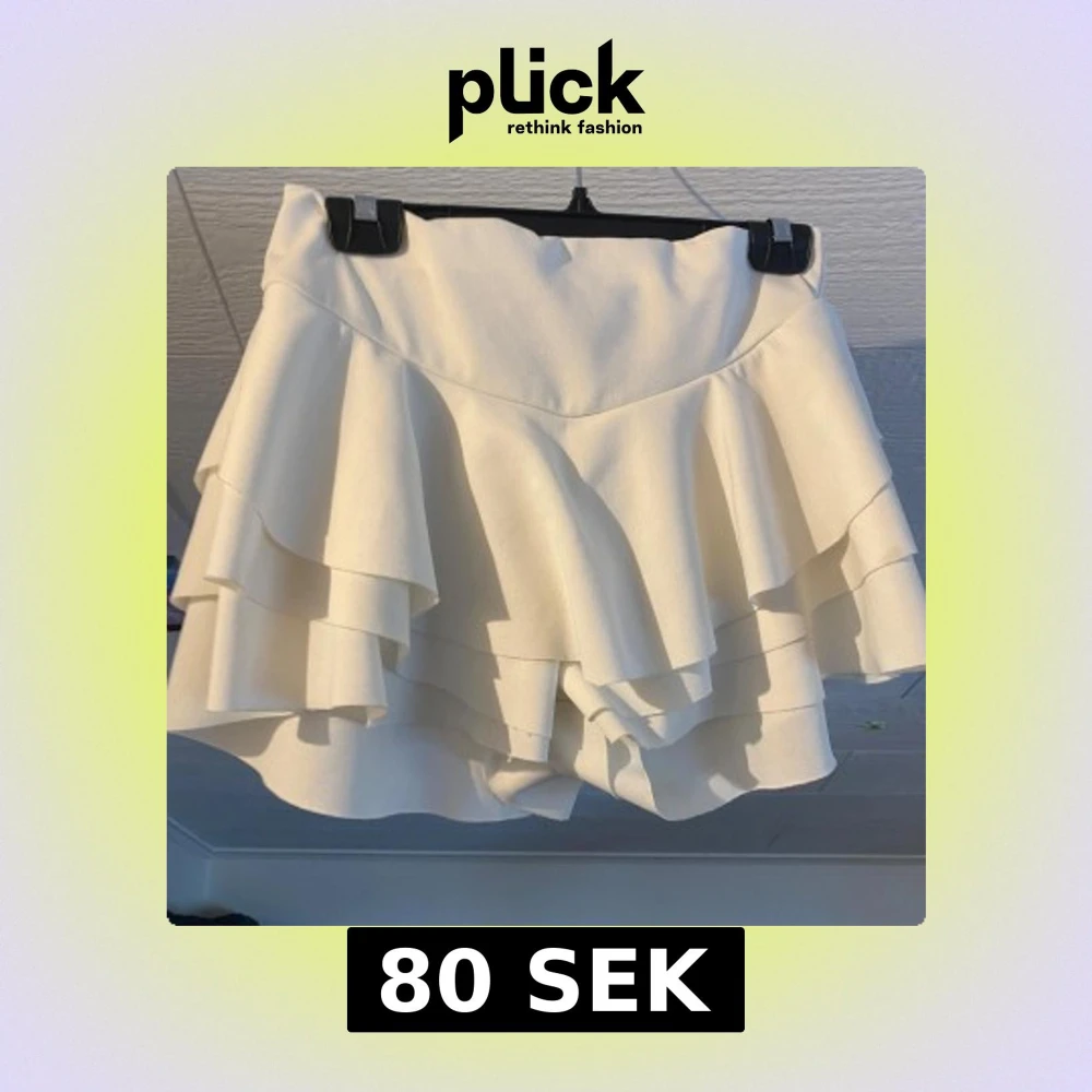 Säljer ett par vita shorts från SHEIN med flera lager volanger som ger en snygg och lekfull look. Shortsen har normal passform och är perfekta för varma dagar. Tillverkade i ett mjukt syntetmaterial.