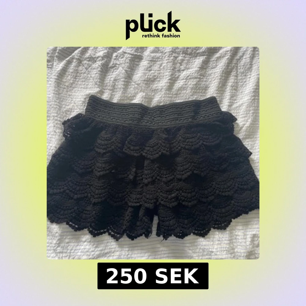 Svarta shorts med bred resår i midjan och flera lager volang i virkad spets. De har en feminin och bohemisk stil med fina detaljer och vågig kant nertill. Perfekta för sommardagar eller festival. Aldrig använt!