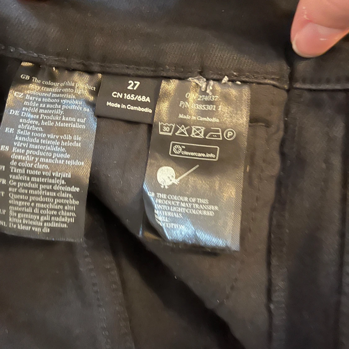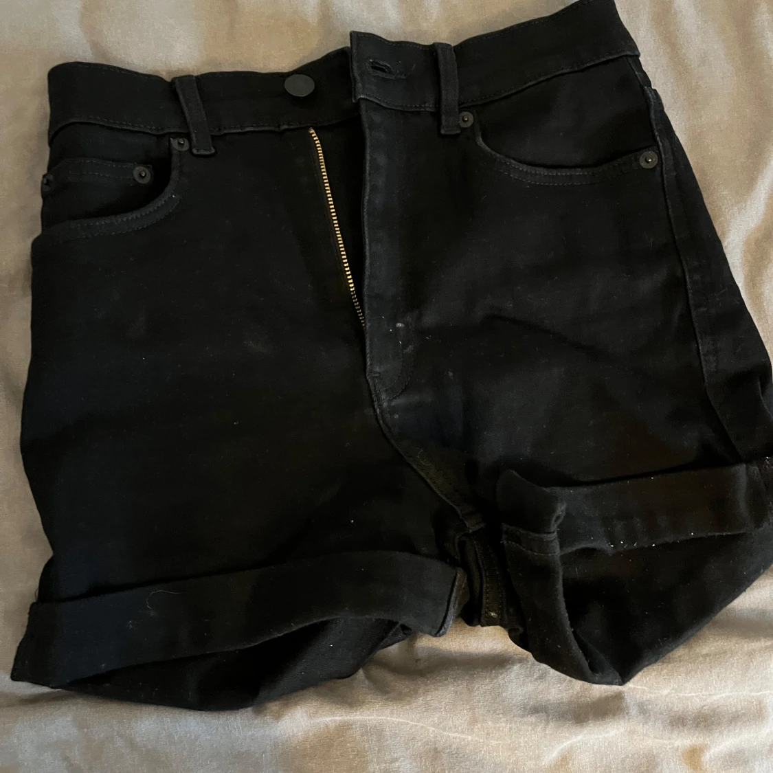 Snygga svarta jeansshorts med upprullade ben och dragkedja fram. Perfekta för en avslappnad stil. De har fem fickor och bälteshällor för extra stil och funktionalitet.
