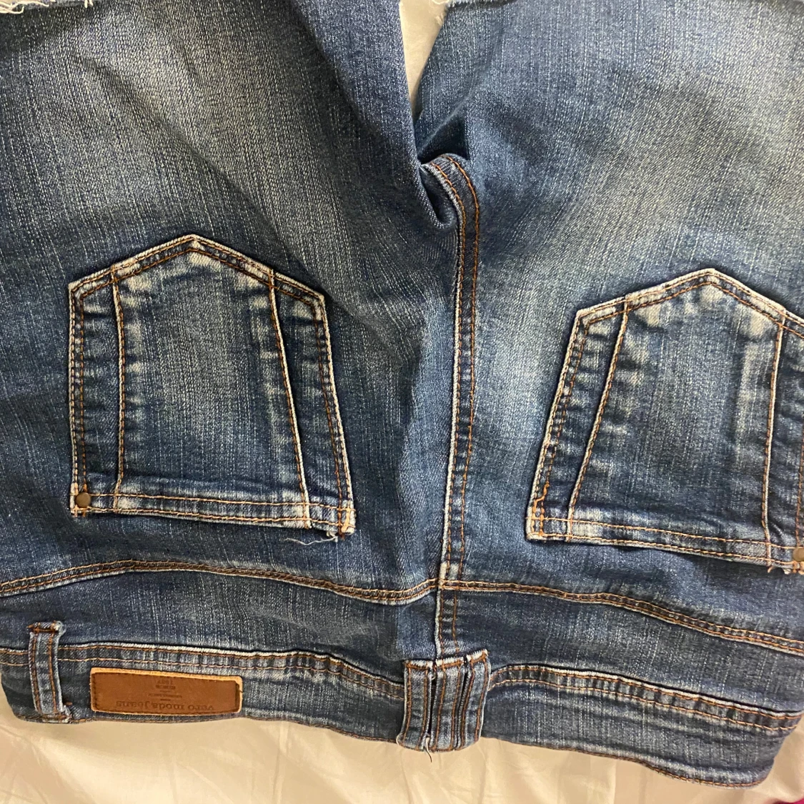 Säljer ett par coola blå jeansshorts från Wrangler med slitna detaljer och klassiska femficksdesign. Perfekta för en avslappnad stil. De har en knapp och dragkedja framtill.