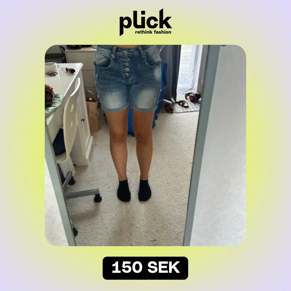 Säljer ett par snygga blå jeansshorts från Place du Jour i storlek 36. De är högmidjade och har en cool knappdetalj framtill. Perfekta för sommaren! Shortsen är i nyskick och har en normal passform. Materialet är mestadels bomull med lite elastan för extra komfort.