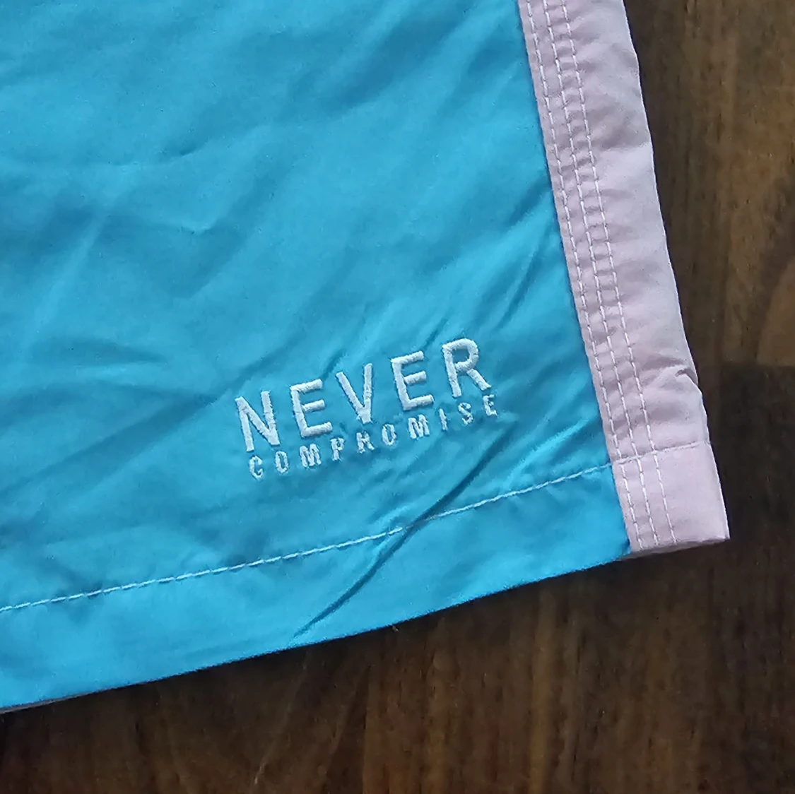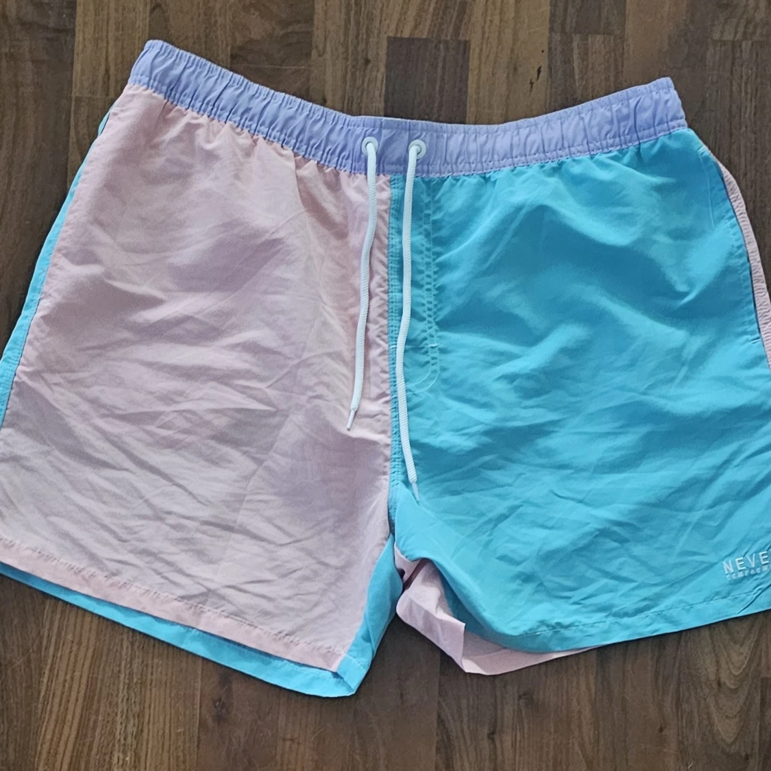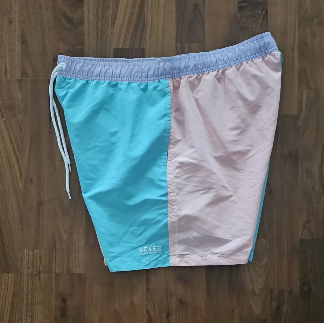 Snygga badshorts i pastellblått och ljusrosa från Never Compromise. De har elastisk midja med vit snörning, bakficka med lock och broderad logga. Perfekta för stranden eller poolen, med en loose fit och lätt syntetmaterial som torkar snabbt.