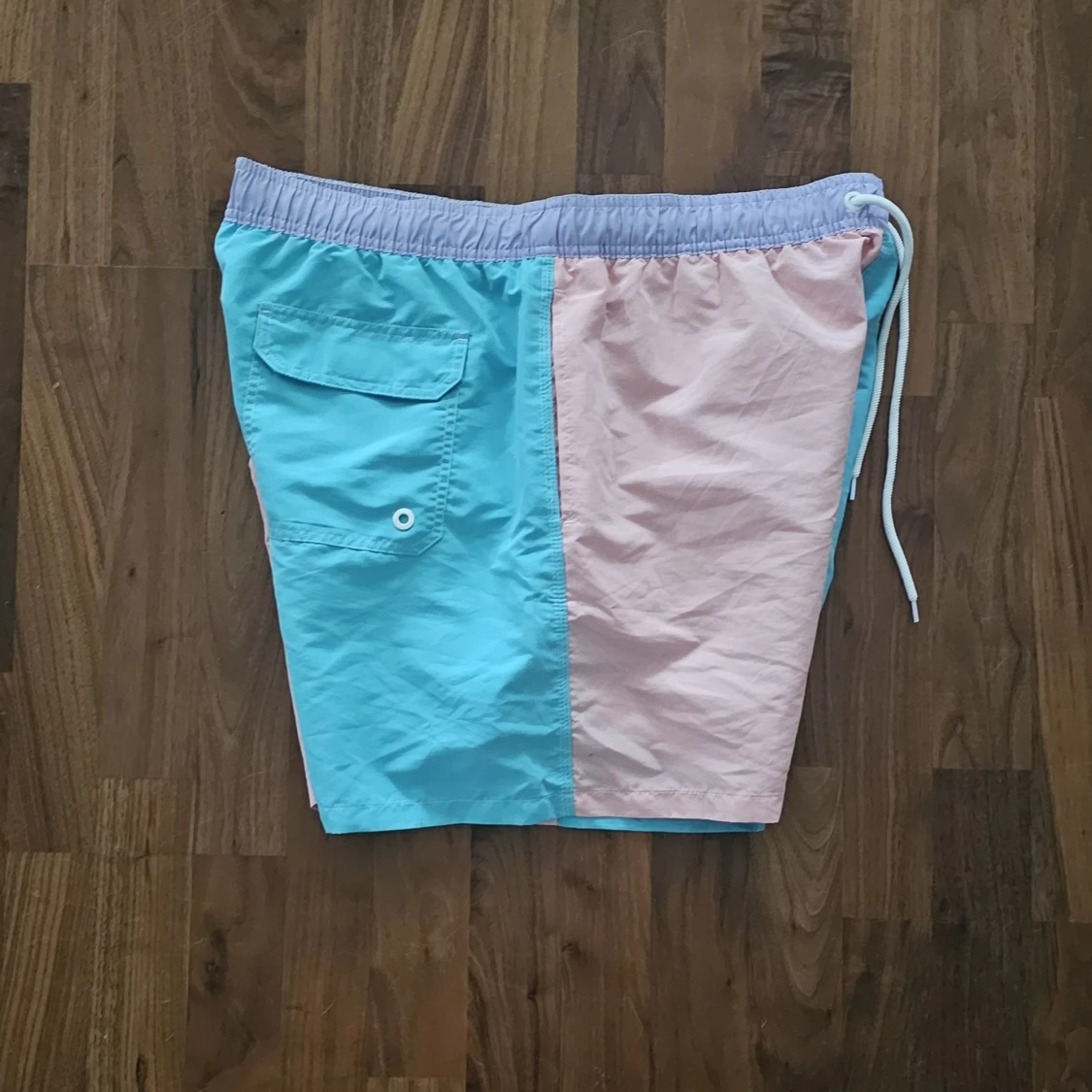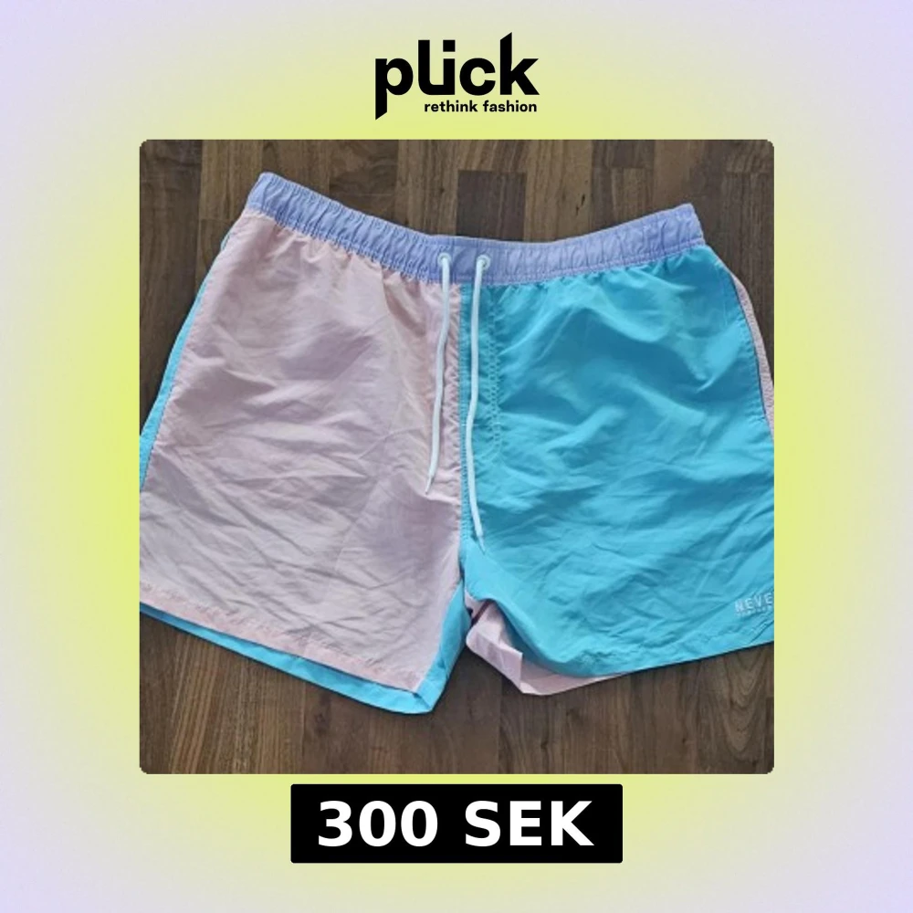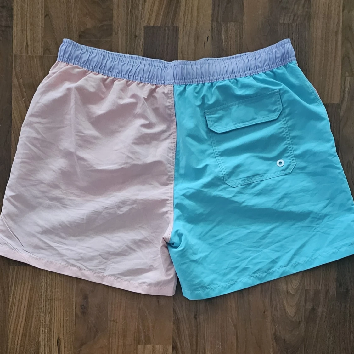 Snygga badshorts i pastellblått och ljusrosa från Never Compromise. De har elastisk midja med vit snörning, bakficka med lock och broderad logga. Perfekta för stranden eller poolen, med en loose fit och lätt syntetmaterial som torkar snabbt.