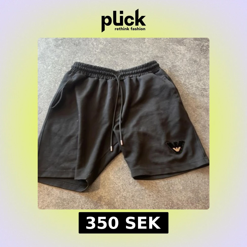 Svarta shorts från Emporio Armani med elastisk midja och snörning. Mjukt bomullsmaterial och klassisk passform. På vänster ben finns en svart och guldig logotypdetalj. Perfekta för en chill och stilren look.