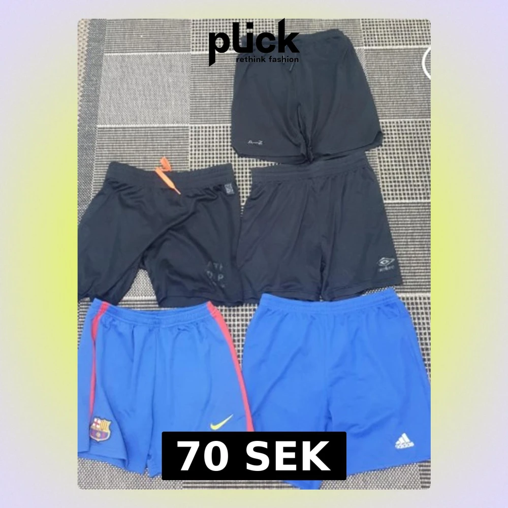 Säljer ett 5-pack sportshorts i svart och blått från Nike, Adidas, Barcelona, A-Z och Umbro. Perfekta för träning eller fotboll. Alla har elastisk midja, vissa med snörning. Materialet är lätt och andas, troligen polyester.