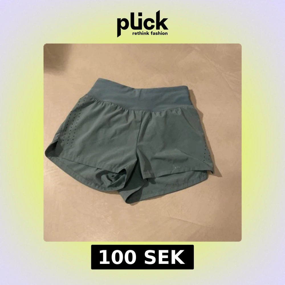 Snygga grågröna träningsshorts från H&M Move med hög midja och bred resår. Shortsen har diskreta håldetaljer på sidorna för ventilation, snörning i midjan och en liten dragkedjeficka bak. Perfekta för löpning eller gymmet.