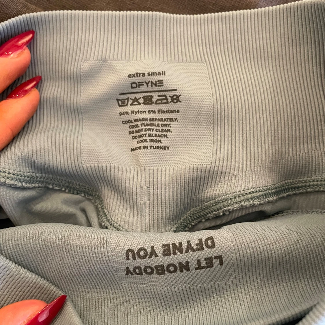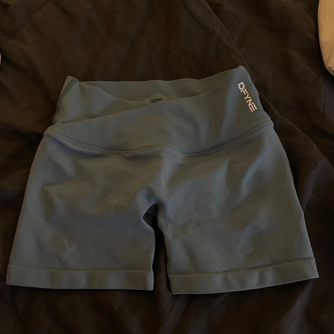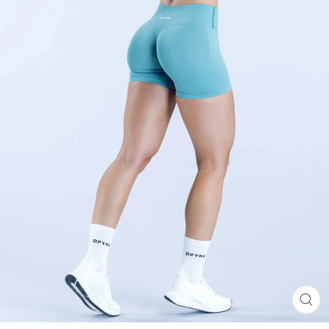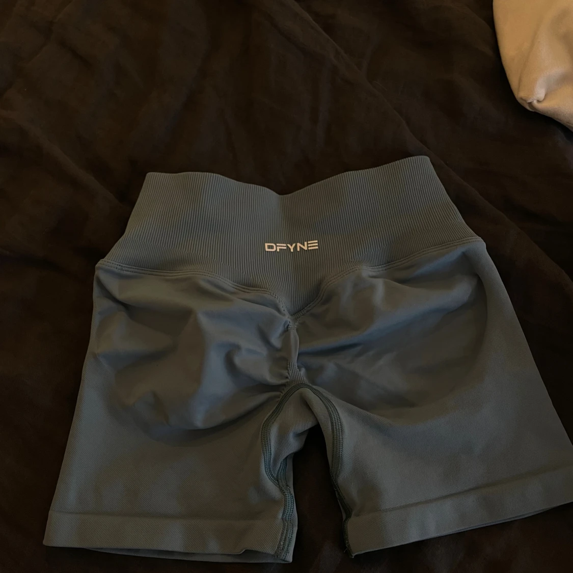 Säljer ett par turkosa seamless träningstights-shorts från DFYNE i storlek XS. De är högmidjade med ribbad linning och tight passform, perfekta för gymmet eller löpning. Materialet är mjukt och stretchigt, 94% nylon och 6% elastan.