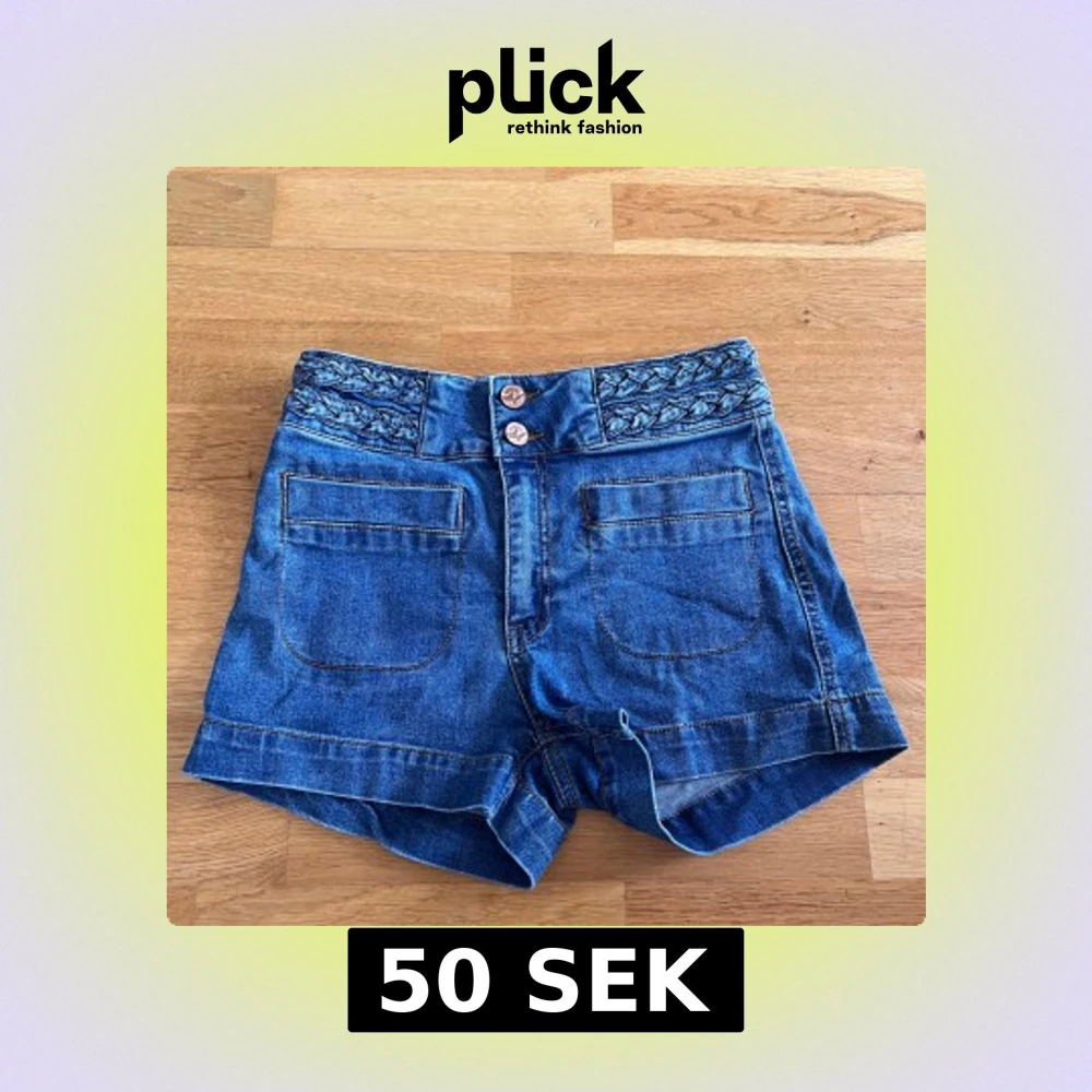 Snygga blå jeansshorts från Never Denim med flätad detalj i midjan och dubbla knappar framtill. Shortsen har stora fickor både fram och bak, och är tillverkade av bomull och polyester med lite stretch för skön passform.
