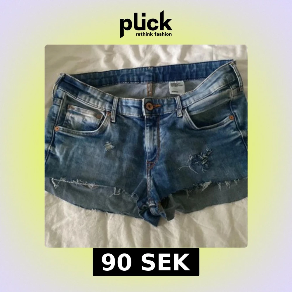 Snygga blå jeansshorts med slitna detaljer och råa kanter. Klassisk femficksmodell med knapp och dragkedja framtill. Perfekta för varma dagar när du vill ha en avslappnad och trendig look. Lågmidjade