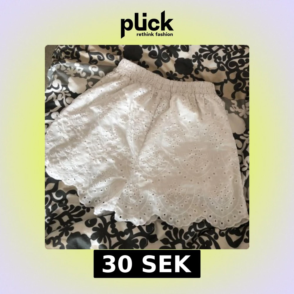 Superfina vita shorts med blommor och spetskant. De har elastisk midja och är perfekta för varma dagar. Luftiga och lätta i bomull, med snyggt mönster och vågig nederkant som ger en söt och somrig vibe.