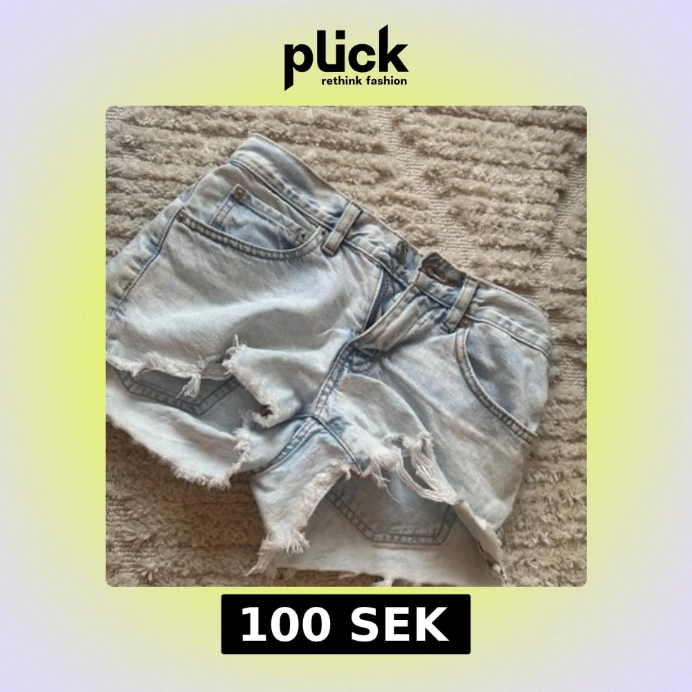 Säljer ett par ljusblå jeansshorts med låg midja och fransiga, slitna kanter. Klassisk femficksmodell med dragkedja och knapp framtill. Perfekt för dig som gillar en chill och avslappnad stil på sommaren.