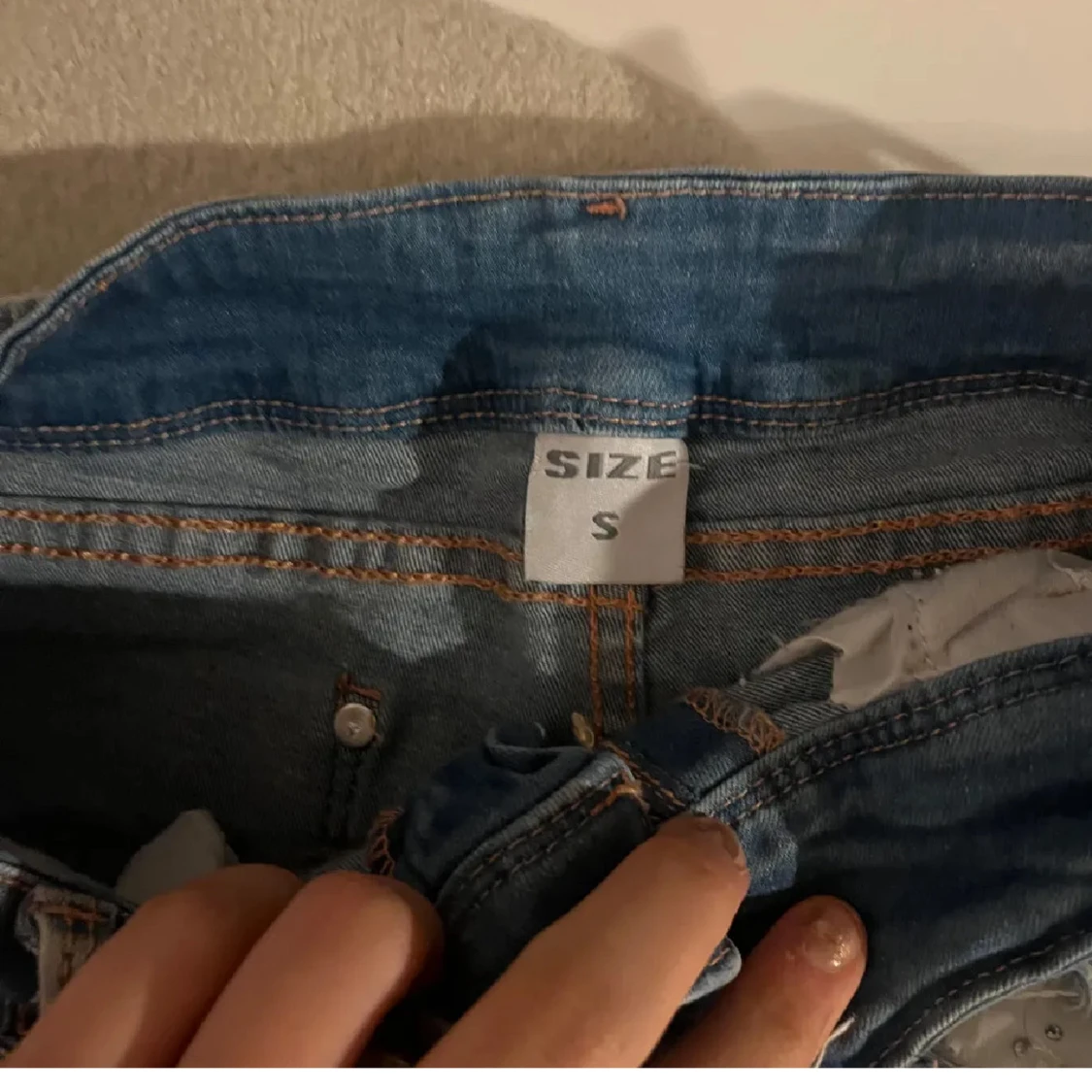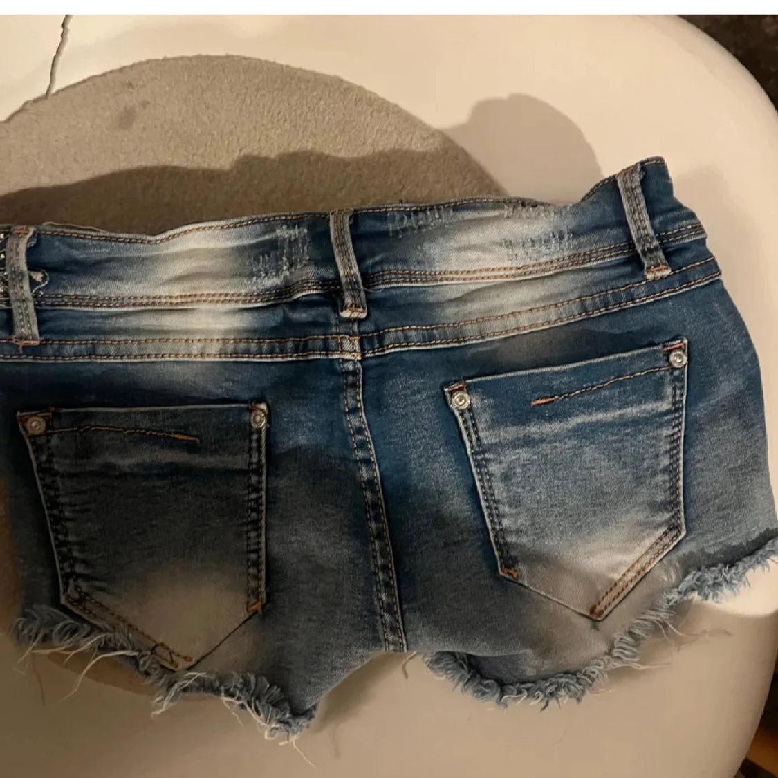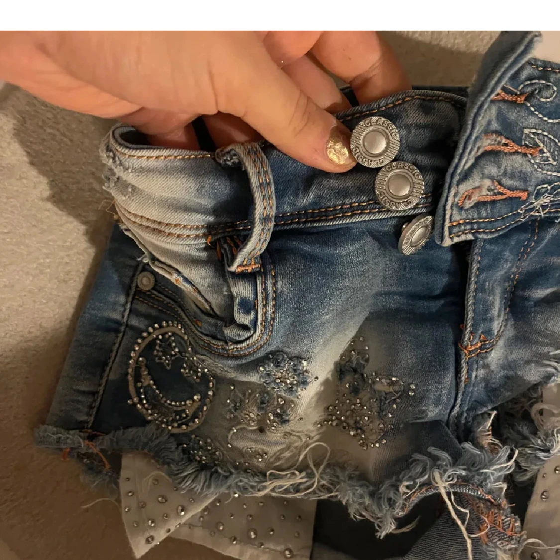 Snygga blå jeansshorts från Angels i storlek S med slitna detaljer, fransig kant och coola pärlbroderier framtill. Shortsens midja har dubbla knappar och dekorativa sömmar. Insidan av benen har vita tygpaneler med pärlor för extra bling. Storlek xs, köp ej direkt!❤️