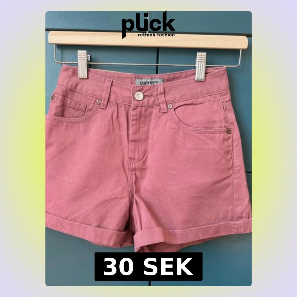 Säljer ett par snygga rosa shorts från WESC med hög midja och klassisk femficksdesign. De har uppvikta benslut, gul WESC-label bak och stängs med knapp och dragkedja. Materialet är mjuk bomull som känns skönt mot huden.