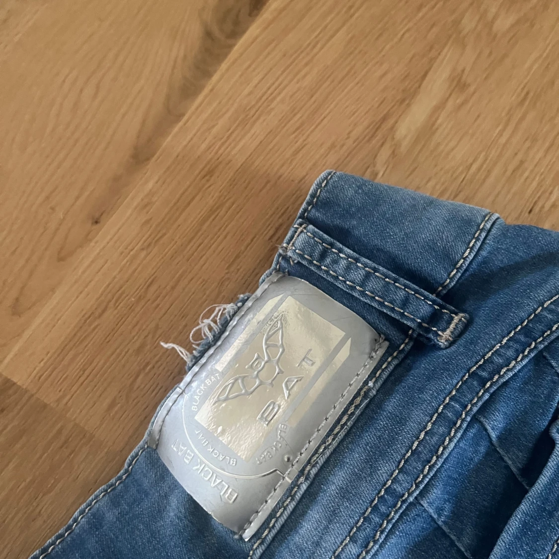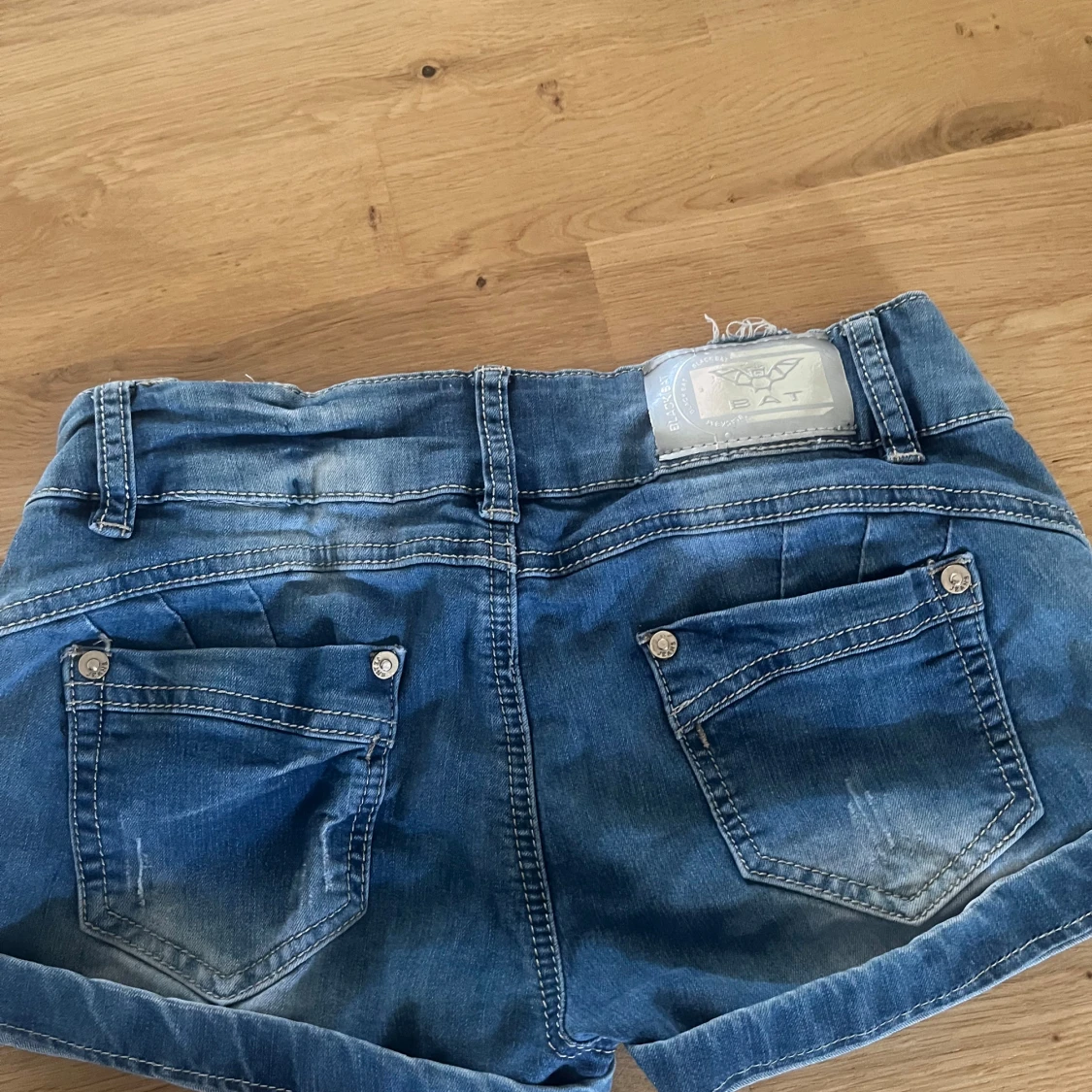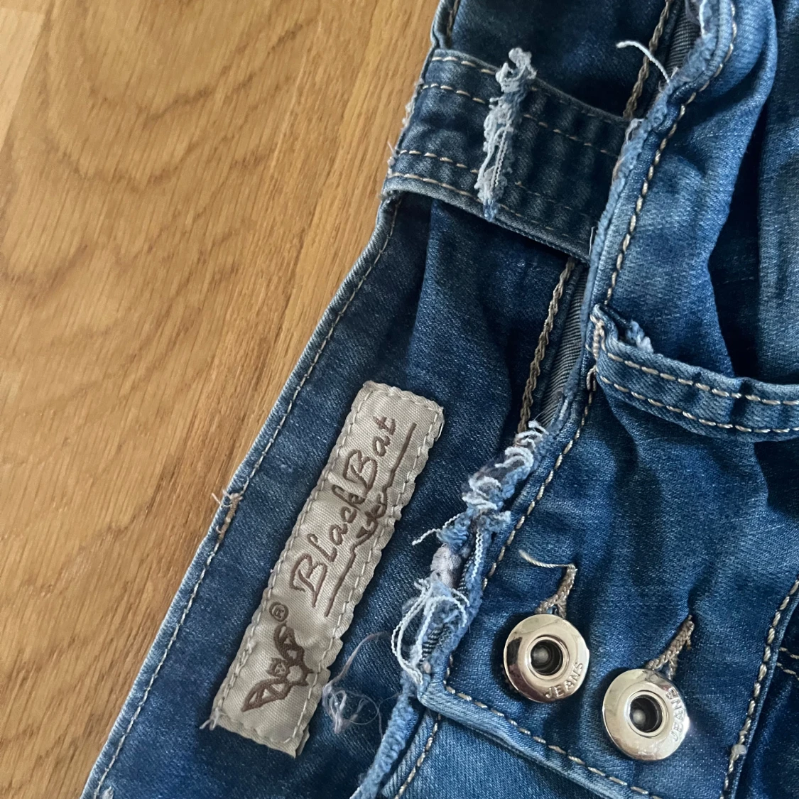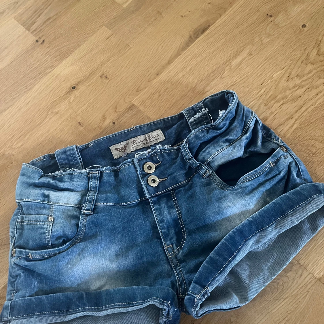 Snygga blå jeansshorts från Black Bat med uppvikta ben, dubbla knappar fram och slitna detaljer vid midjan. Klassiska fem fickor och tydliga kontrastsömmar ger en cool look. Perfekt för dig som gillar streetstyle och denim.