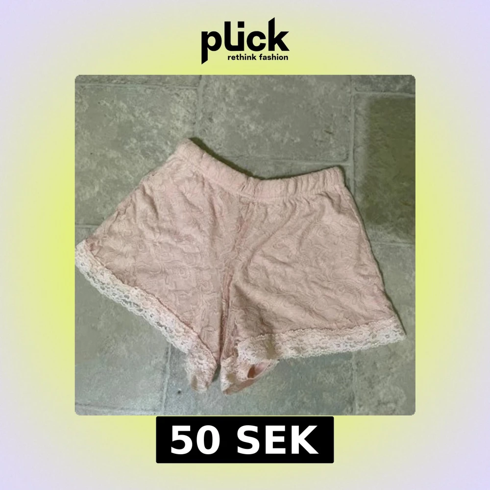 Säljer ett par ljusrosa shorts med vacker spetsdetalj längs bensluten. Shortsen har en mjuk resår i midjan och är täckta av ett diskret blommönster i spets. Perfekta för en söt och feminin look. Perket att sova med.