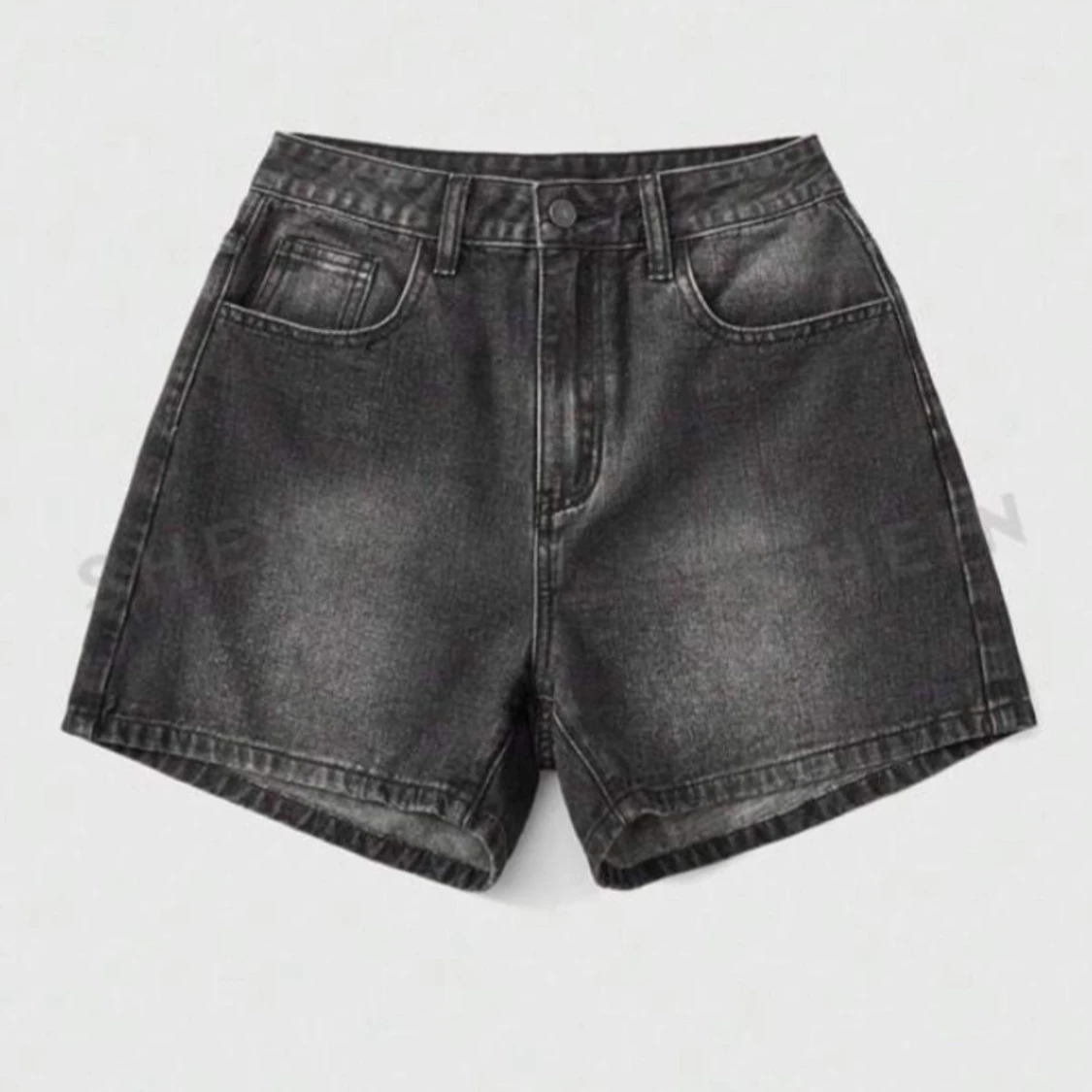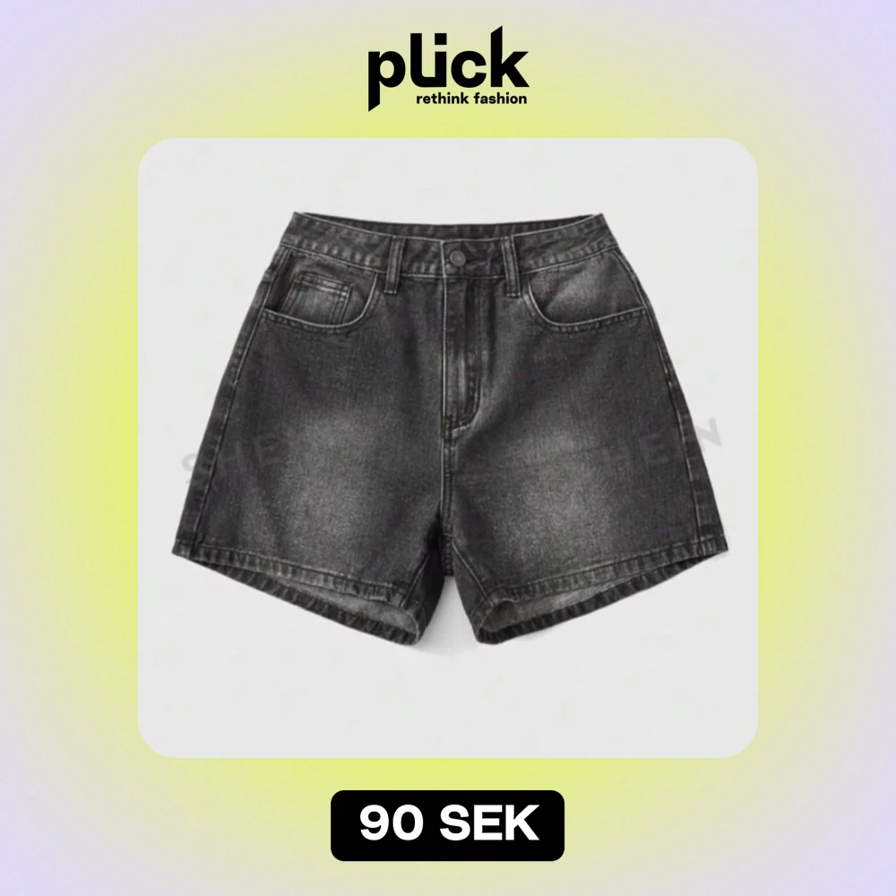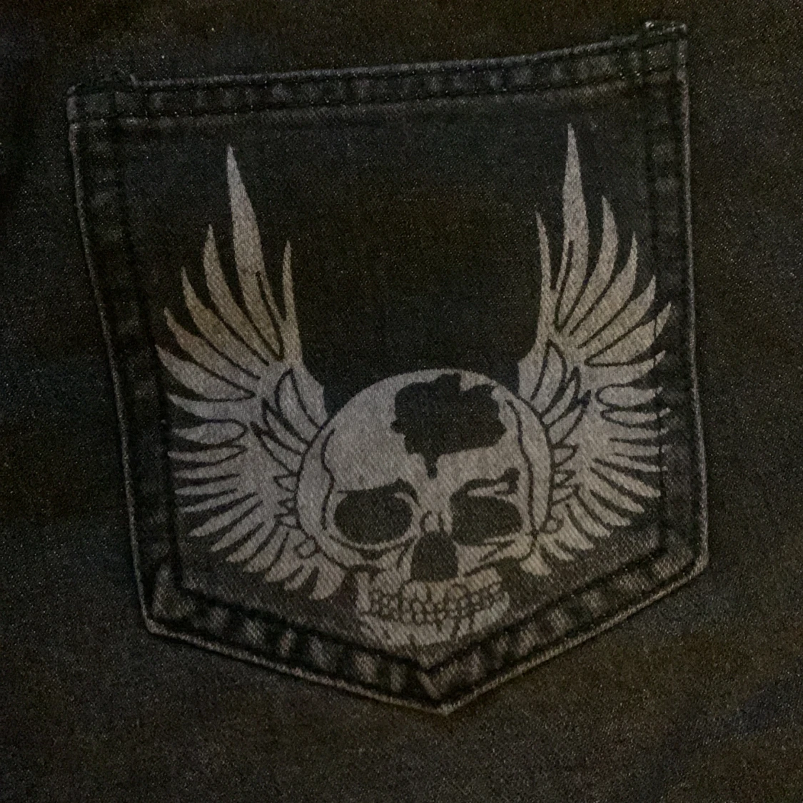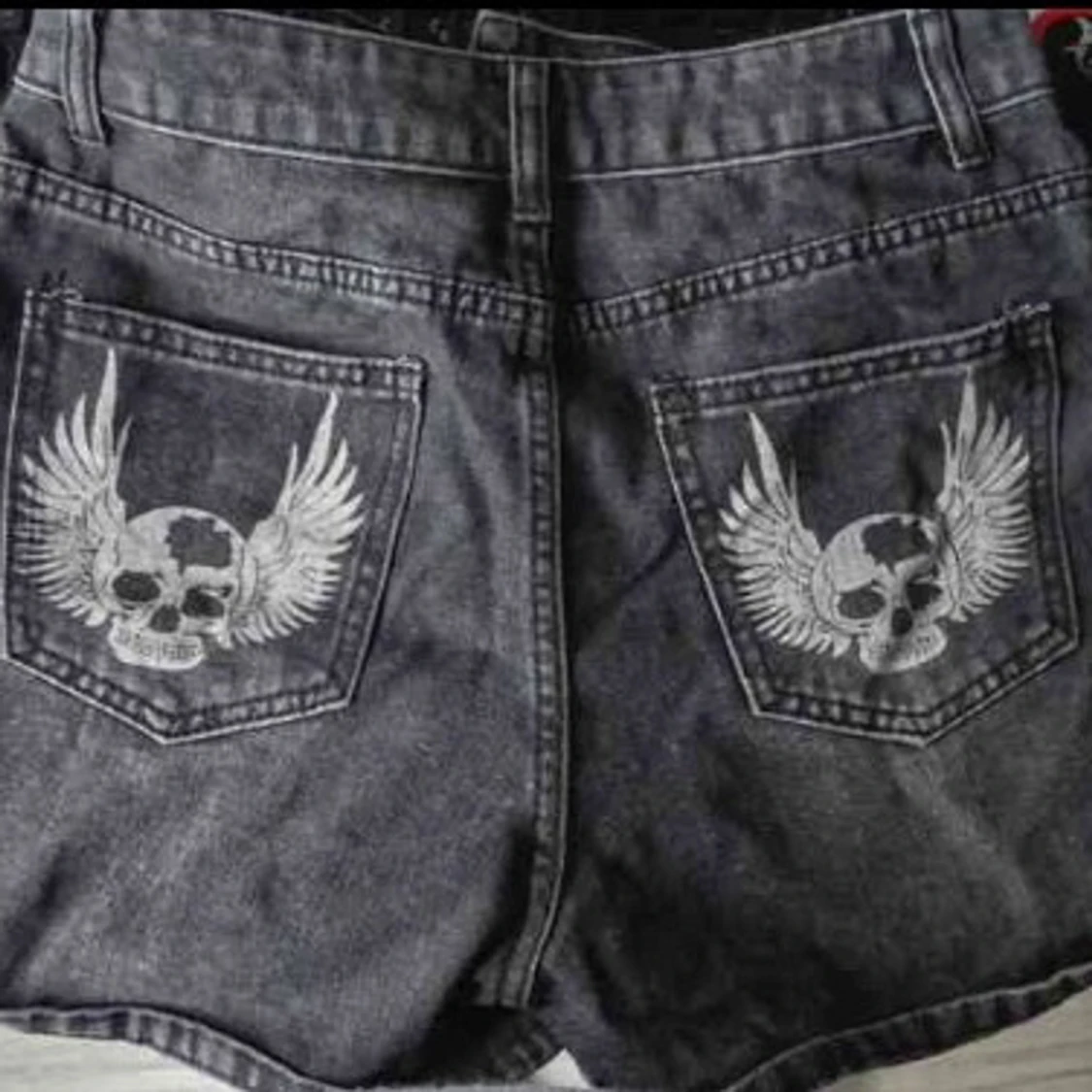 Coola svarta jeansshorts/jorts med ett unikt dödskalletryck med vingar på bakfickorna. Mått: längd 38 cm.