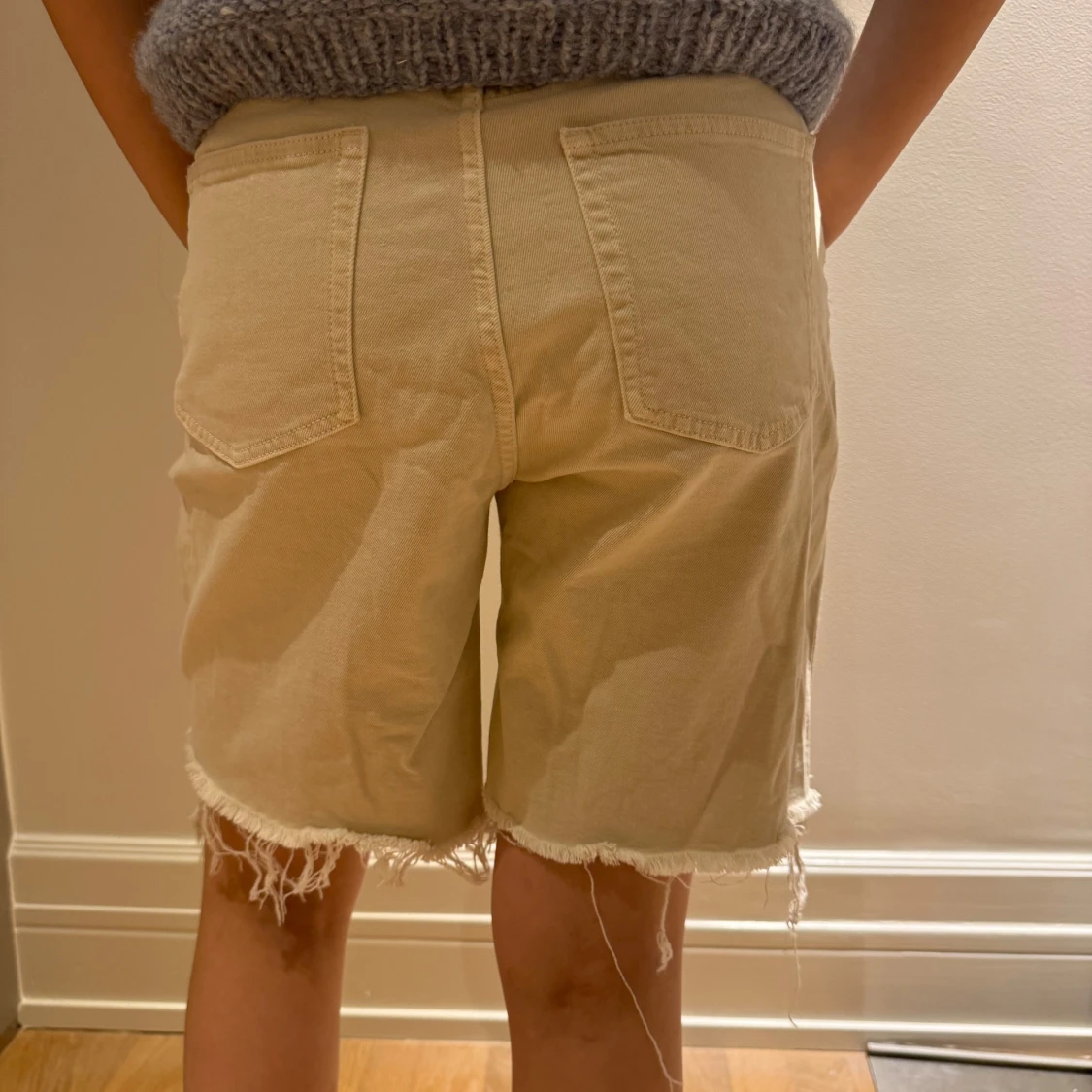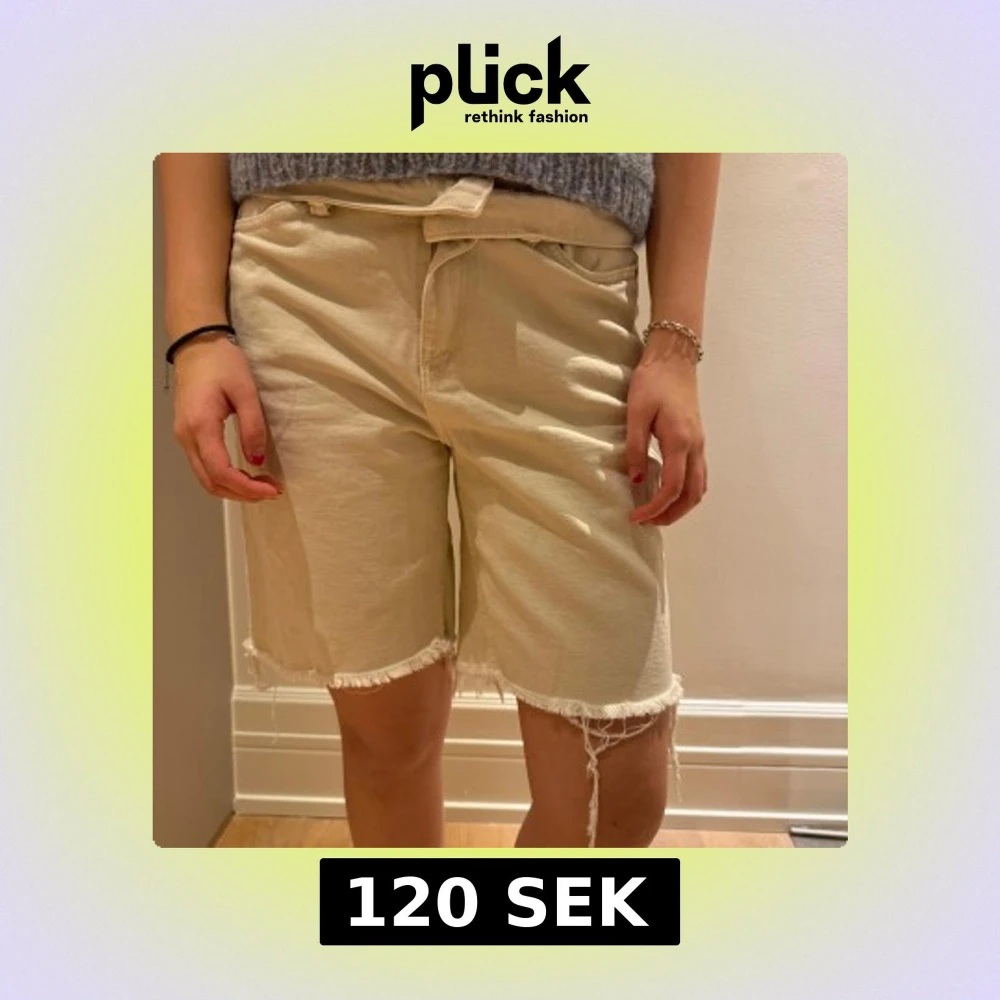 Säljer ett par beigea shorts med fransiga kanter. Supersköna❤️i bilden är midjebandet nedvikt