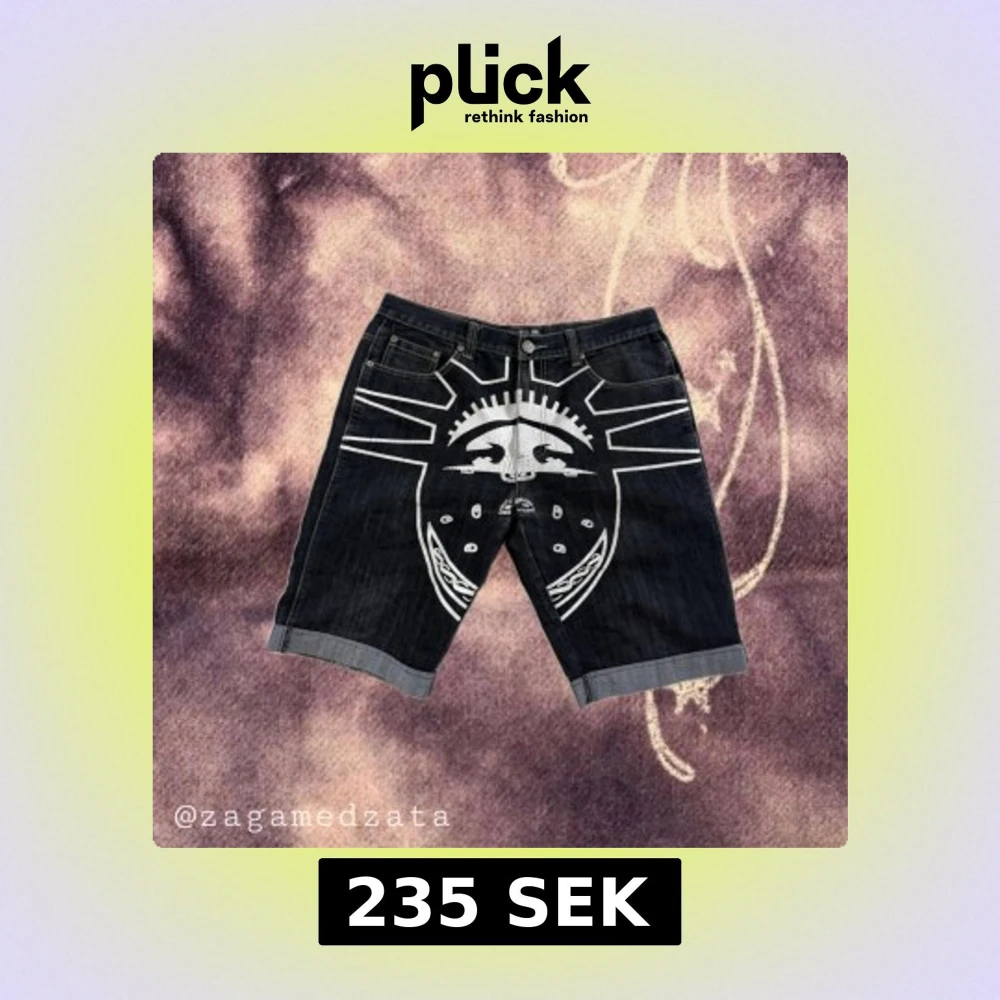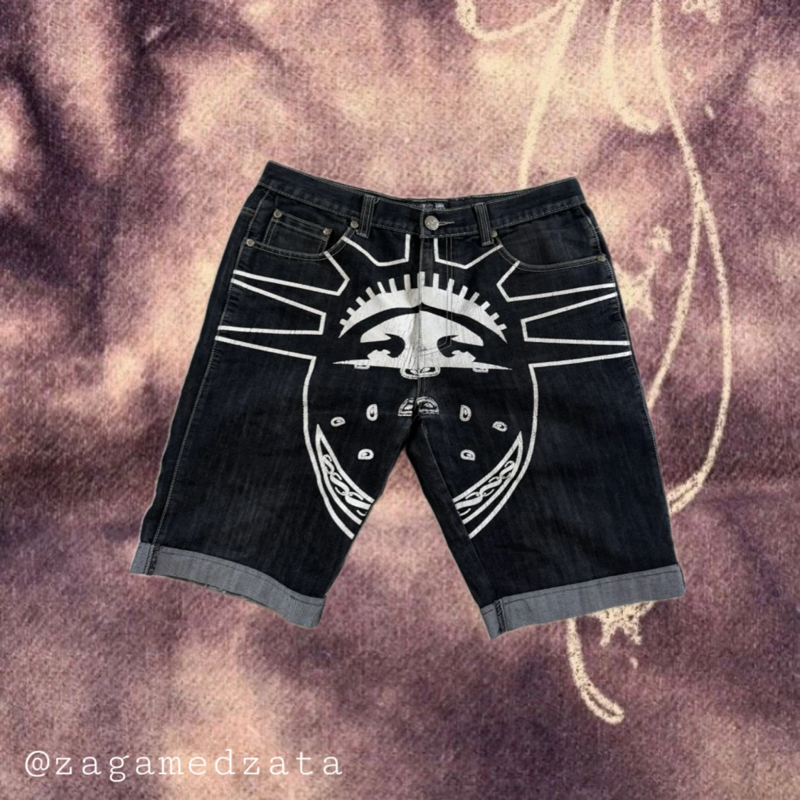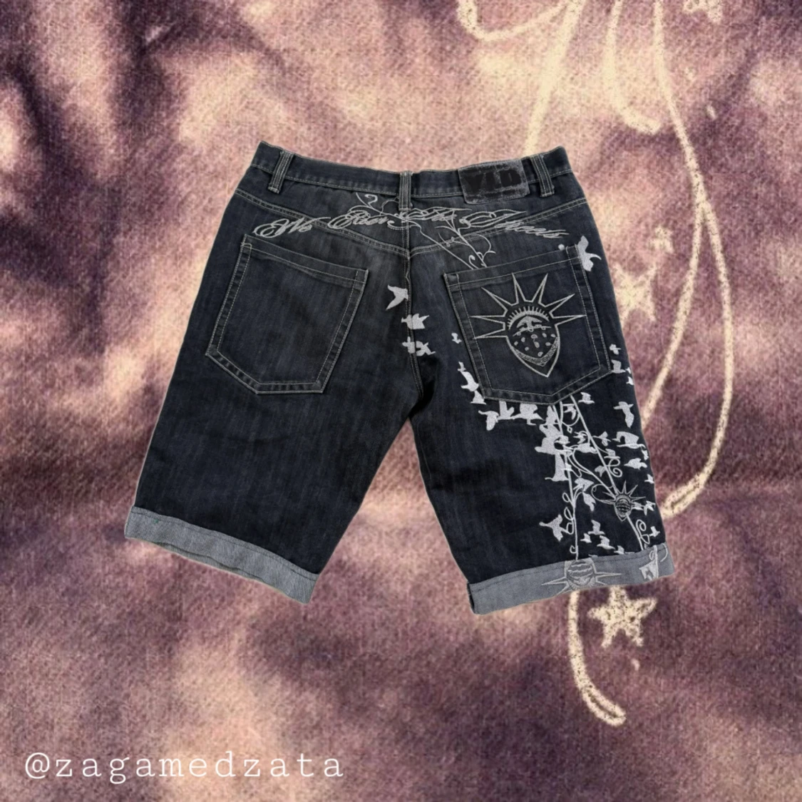 Unika svarta jeansshorts från YLD Jeans Local Dealer med stora vita tryck och broderier fram och bak. Shorts med loose fit, coola grafiska motiv och detaljerade sömmar. Perfekta för dig som vill sticka ut med streetwear-vibe och edgy stil.