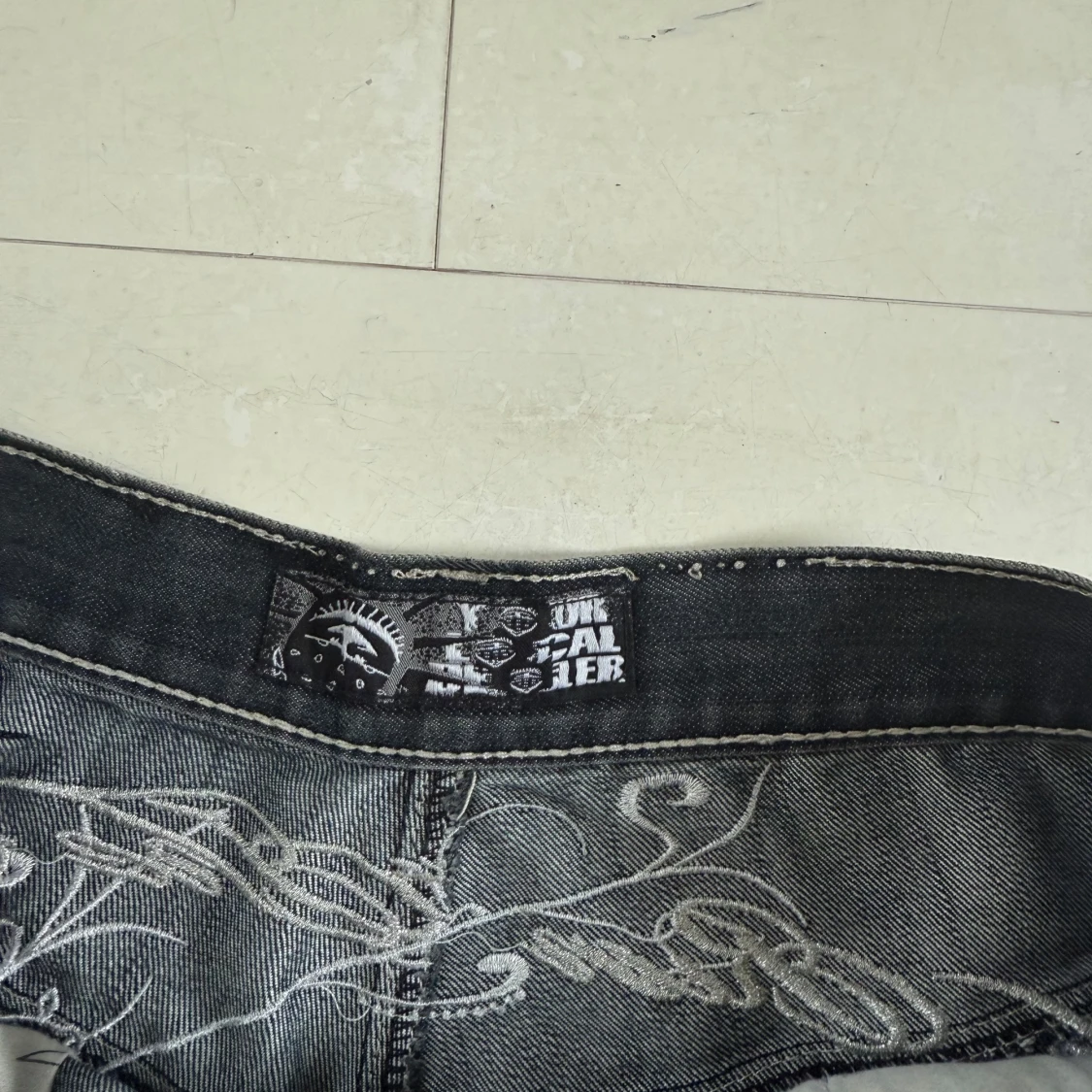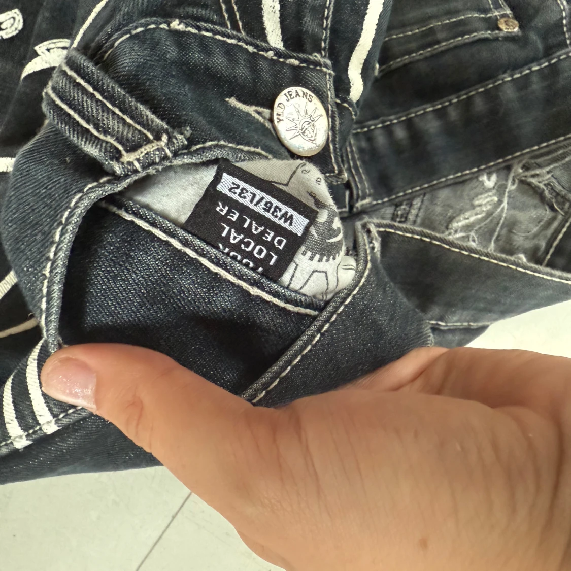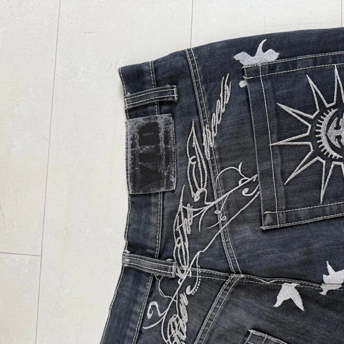 Unika svarta jeansshorts från YLD Jeans Local Dealer med stora vita tryck och broderier fram och bak. Shorts med loose fit, coola grafiska motiv och detaljerade sömmar. Perfekta för dig som vill sticka ut med streetwear-vibe och edgy stil.