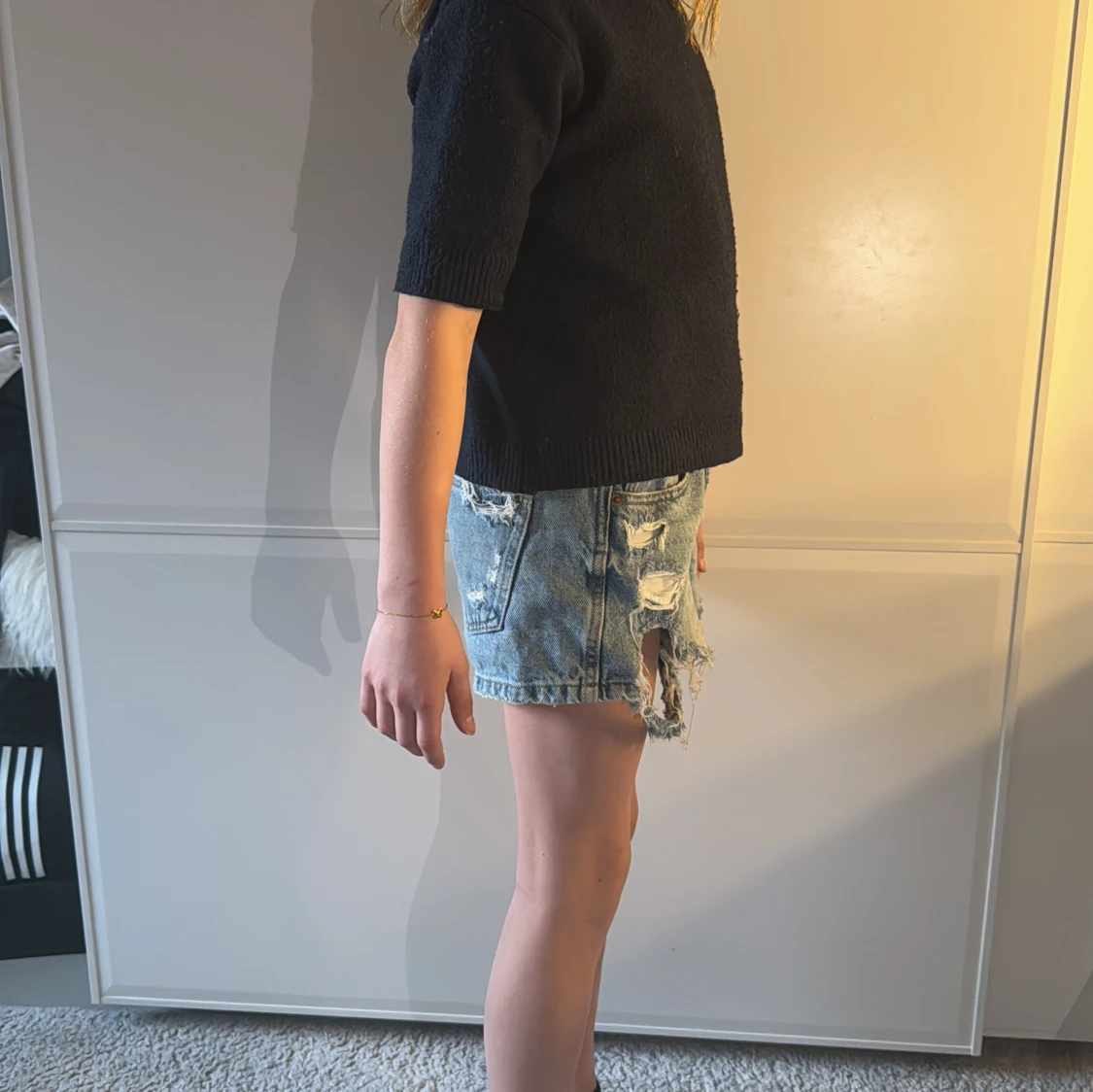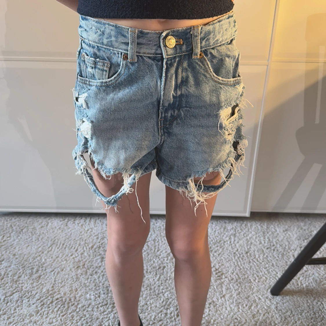 Snygga blå jeansshorts med slitna detaljer och fransar. Perfekta för en avslappnad stil. De har en klassisk femficksdesign och knappgylf.