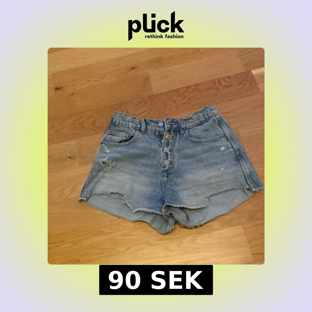 Säljer ett par blå jeansshorts från Zara med knappar framtill. Shortsen har råa kanter, slitningar och klassiska fickor både fram och bak. Perfekta för sommaren! Storleken är 164!!