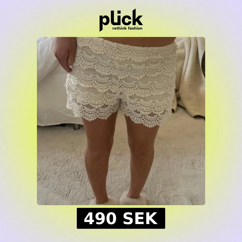Säljer ett par vita shorts med vacker spets och volangdetaljer. De har en normal passform och är perfekta för sommaren. En liten reva men inget man tänker på eftersom dom är ”håliga”