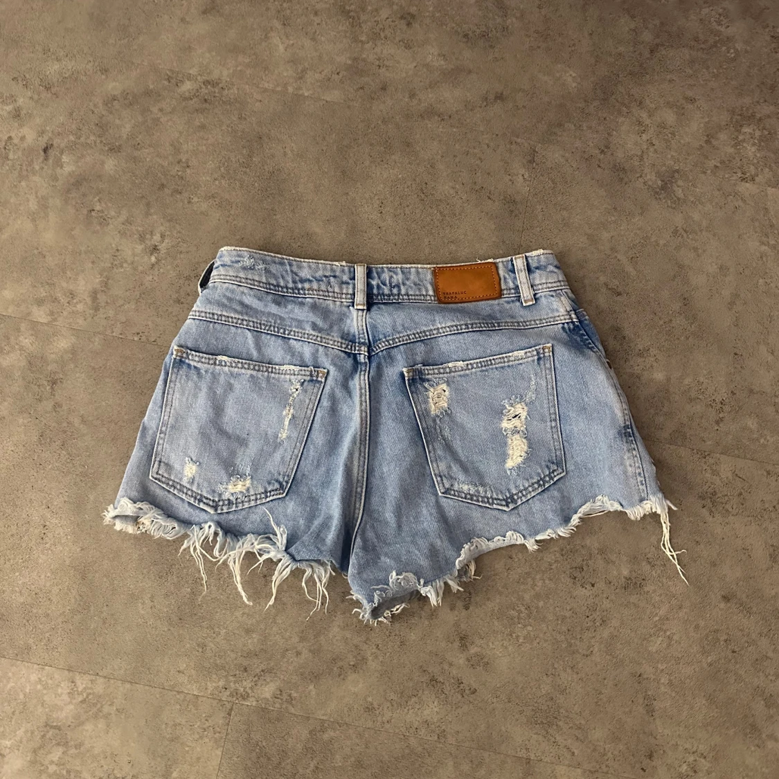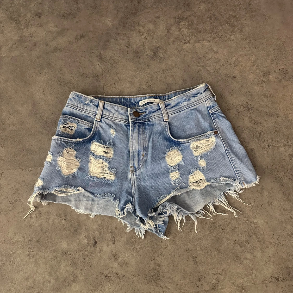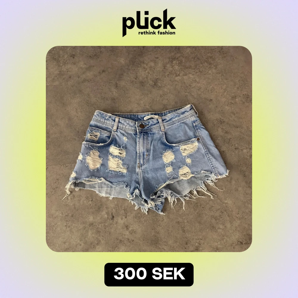 Säljer ett par coola blå jeansshorts med slitningar och fransiga kanter. Perfekta för en avslappnad sommarlook. De har en knapp och dragkedja framtill samt fem fickor. Passar perfekt för festivaler eller en dag på stranden!