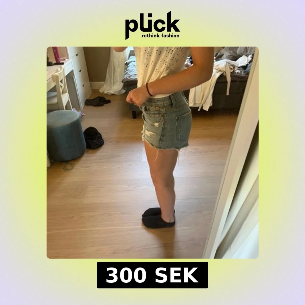Säljer ett par klassiska blå jeansshorts med hög midja och råa, fransiga kanter. Shortsen har slitna detaljer framtill och bakfickor. Perfekta för sommaren och ger en avslappnad vibe till din outfit.