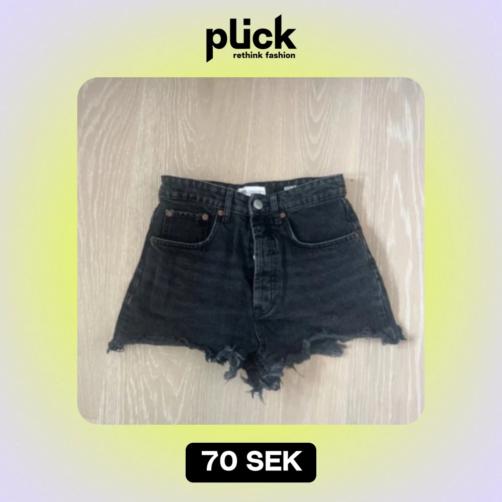 Säljer ett par svarta jeansshorts från Zara i storlek 36. De är högmidjade och har en snygg, sliten look med fransiga kanter. Perfekta för sommaren eller en avslappnad dag ute. De har knappar framtill.