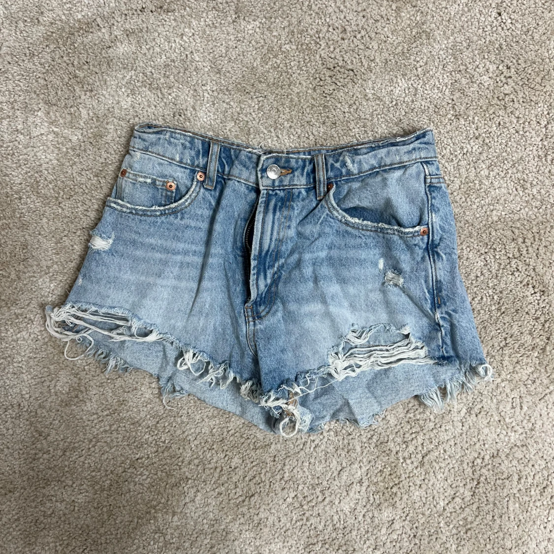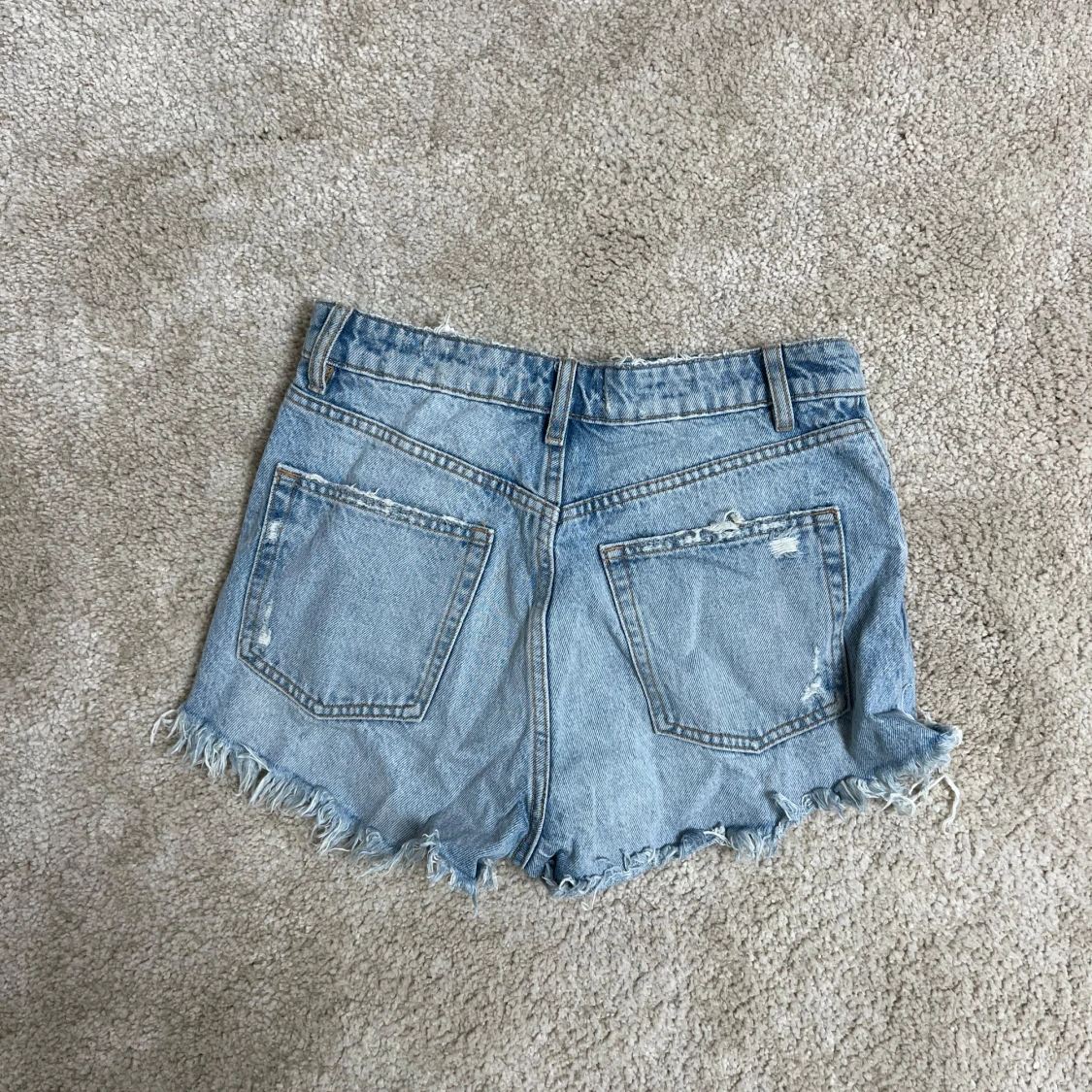 Säljer ett par coola blå jeansshorts med fransiga kanter och slitna detaljer. Shortsen har en klassisk femficksdesign och knappgylf. Knappt använda.