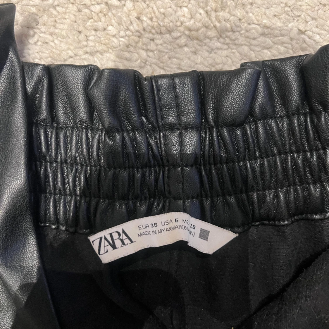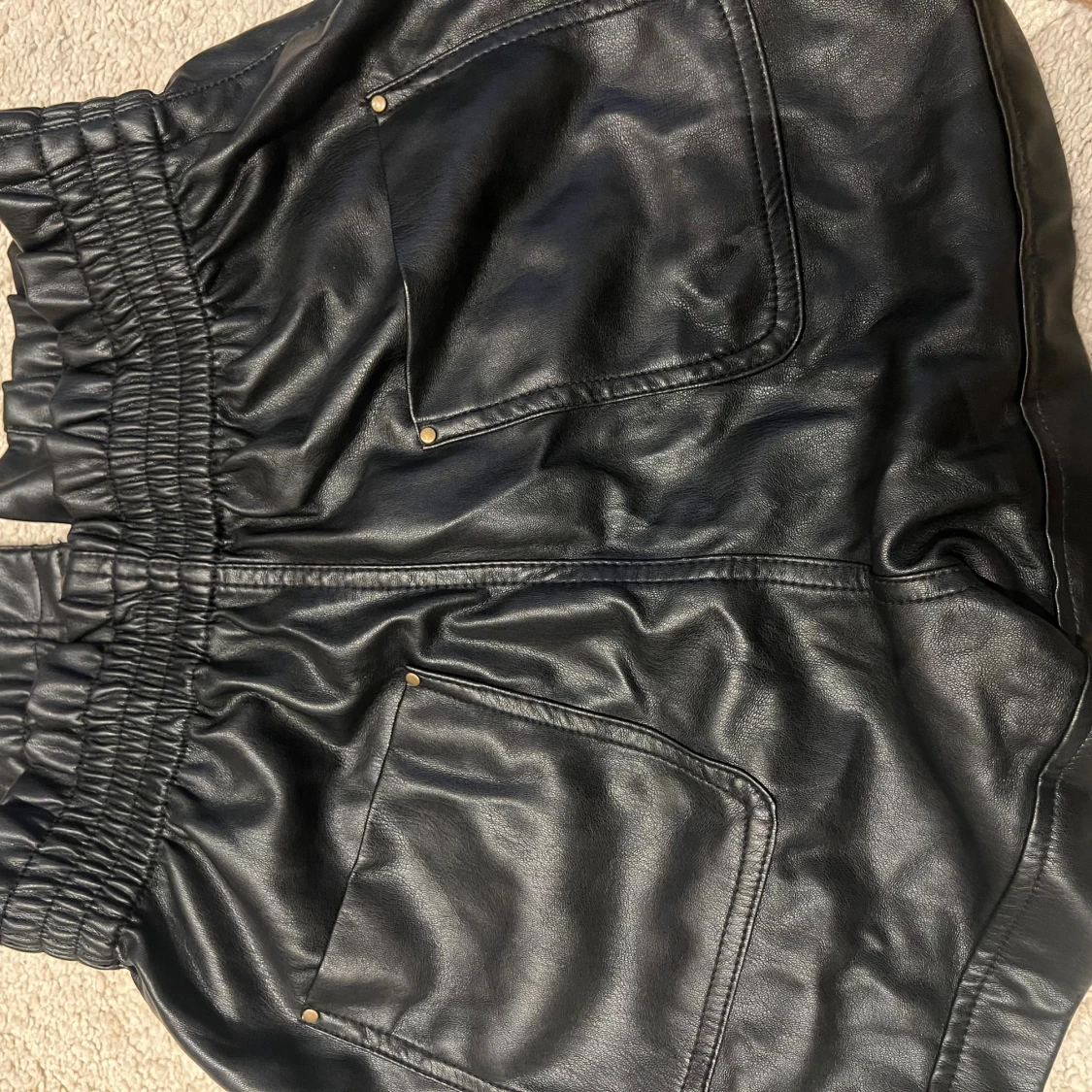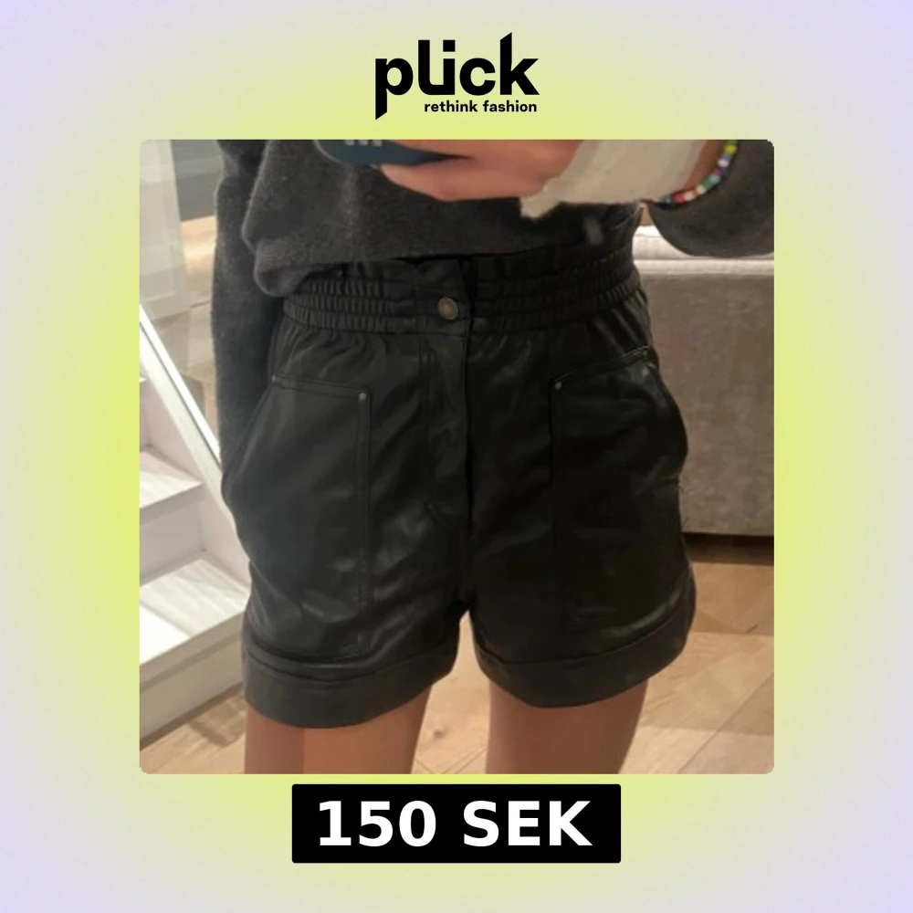 Säljer ett par svarta högmidjade shorts från Zara i snyggt skinnimitation. De har bred resår i midjan, stora fickor framtill och uppvikta benslut. Strl 38 🫶🏻