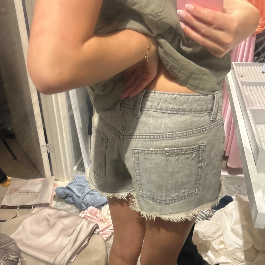 Snygga grå jeansshorts med slitna detaljer och fransig kant nertill. Klassisk femficksmodell med bälteshällor och dragkedja. Perfekta för sommaren och ger en avslappnad vibe.