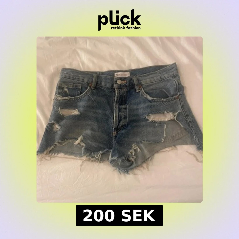Säljer ett par coola blå jeansshorts från Zara med slitna detaljer och fransar. De har en klassisk femficksdesign och knappgylf. Perfekta för en avslappnad stil.