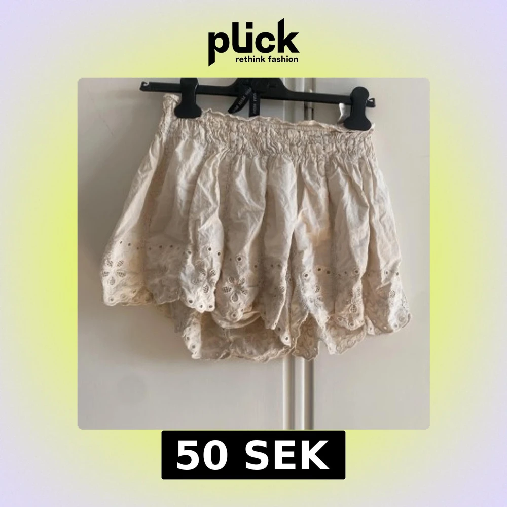 Supersöta vita shorts med hög midja och bred resår. De har broderade detaljer och spetskant med blommönster längst ner, vilket ger en romantisk och somrig vibe. Perfekta till varma dagar och lätta att matcha med en enkel topp.