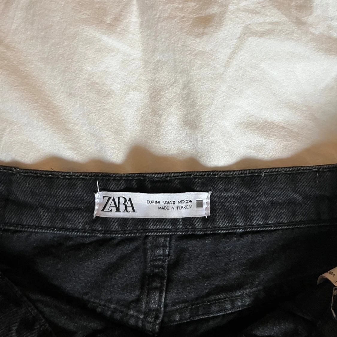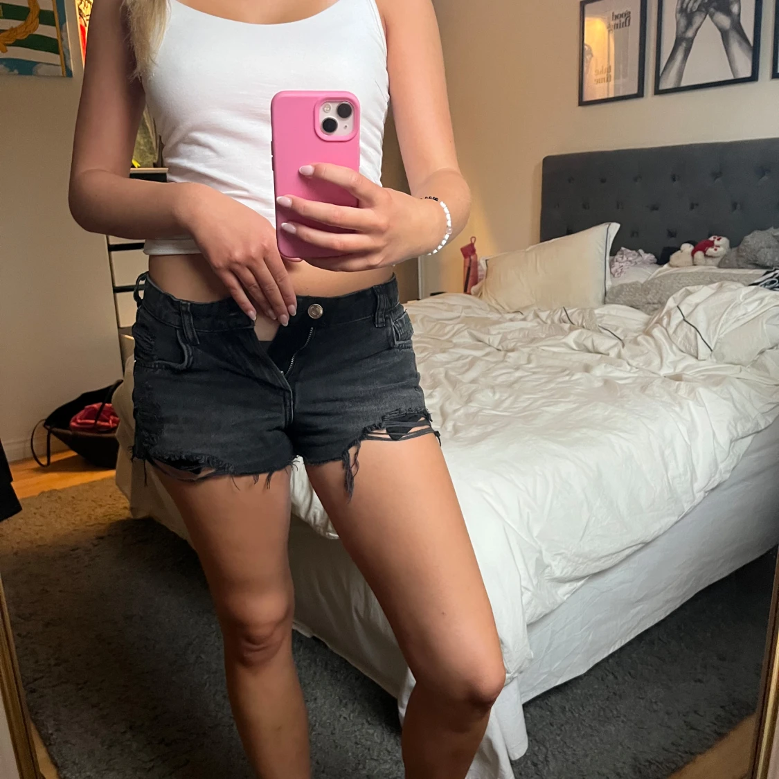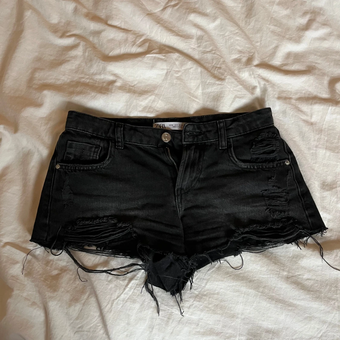 Säljer ett par svarta jeansshorts från Zara i storlek 34. De är lågmidjade med slitningar.