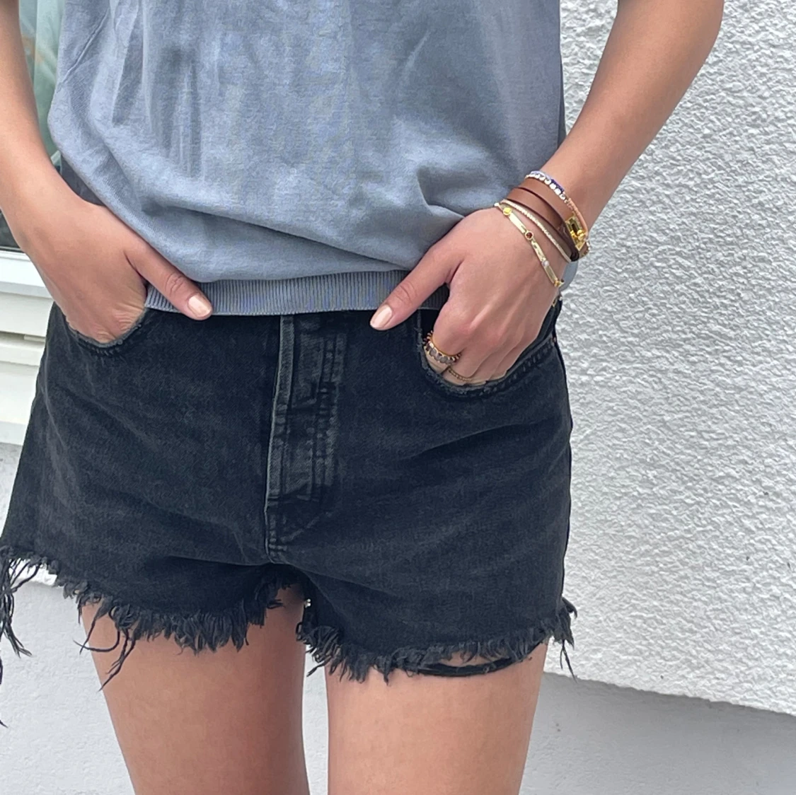 Jeansshorts i urtvättad svart/grå med slitningar från Zara🤍 Storlek 40 men sitter bra på mig som har S. (Finns fler produktbilder vid intresse)