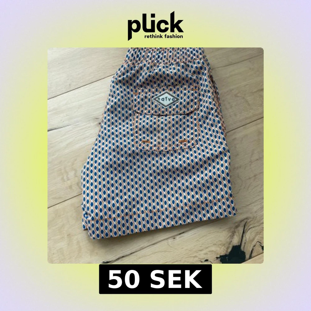 Färgglada badshorts från Naive med blått, orange och vitt geometriskt mönster. Shortsen har elastisk midja med snörning och en bakficka med lock och logga. Perfekta för stranden eller poolen, riktigt sköna och lätta att bära.