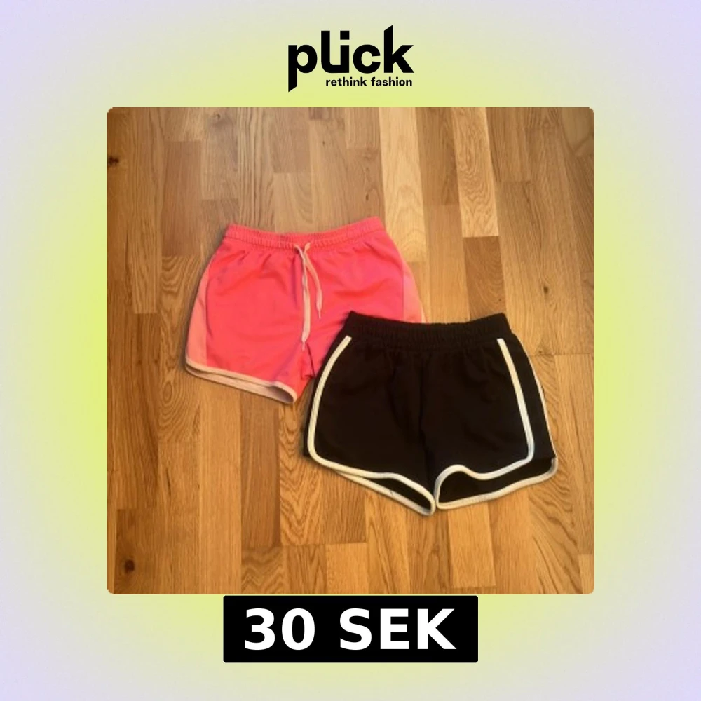 Säljer två par sportiga shorts, ett par i stark rosa med ljusrosa kant och snörning i midjan, samt ett par svarta med vit kant. Båda har elastisk midja och är tillverkade i ett lätt, ventilerande syntetmaterial. Perfekta för träning eller chill på sommaren.svarta:20kr storlek 146,rosa:15kr eftersom det är lite fläckar där bak storlek 122/128,båda:30kr
