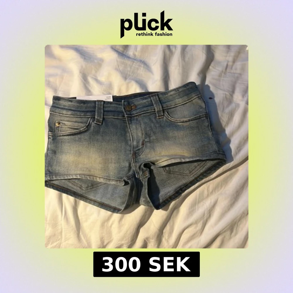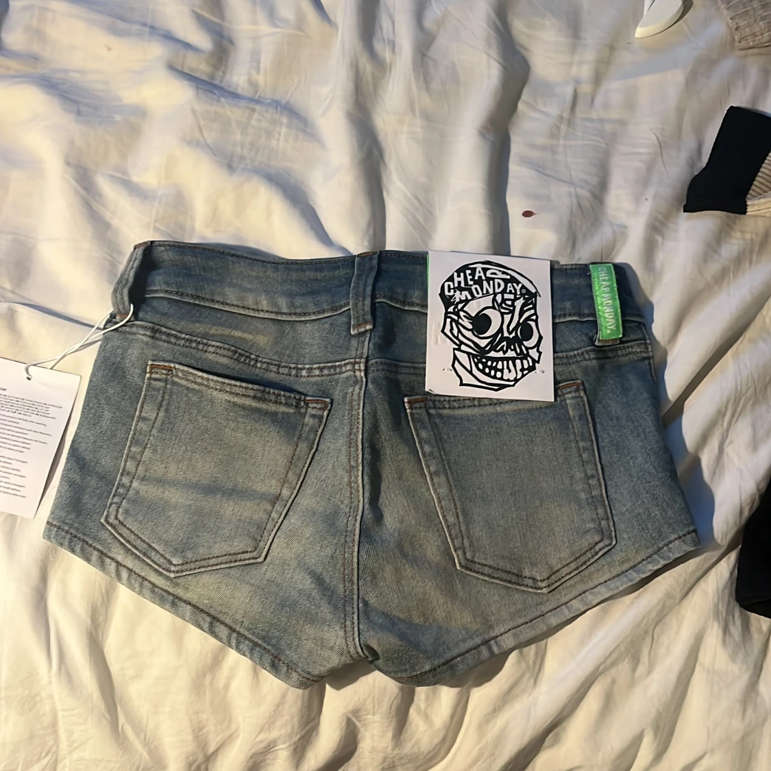 Snygga ljusblå jeansshorts från Cheap Monday med låg midja och klassisk femficksdesign. Modellen är tight och superstretchig, perfekt för sommaren. Ikonisk Cheap Monday-dödskalle på knappen. helt nya str 28