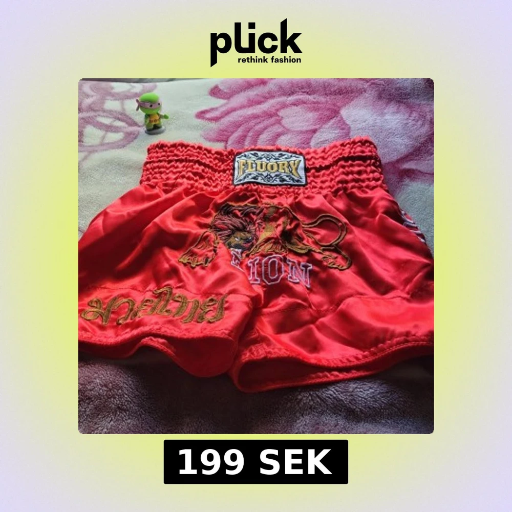 Snygga röda Muay Thai shorts från Fluory med broderad lejon-design och guldig text framtill. De har bred resår i midjan för extra komfort och är tillverkade i glansigt satinmaterial. Perfekta för dig som vill sticka ut på träningen!